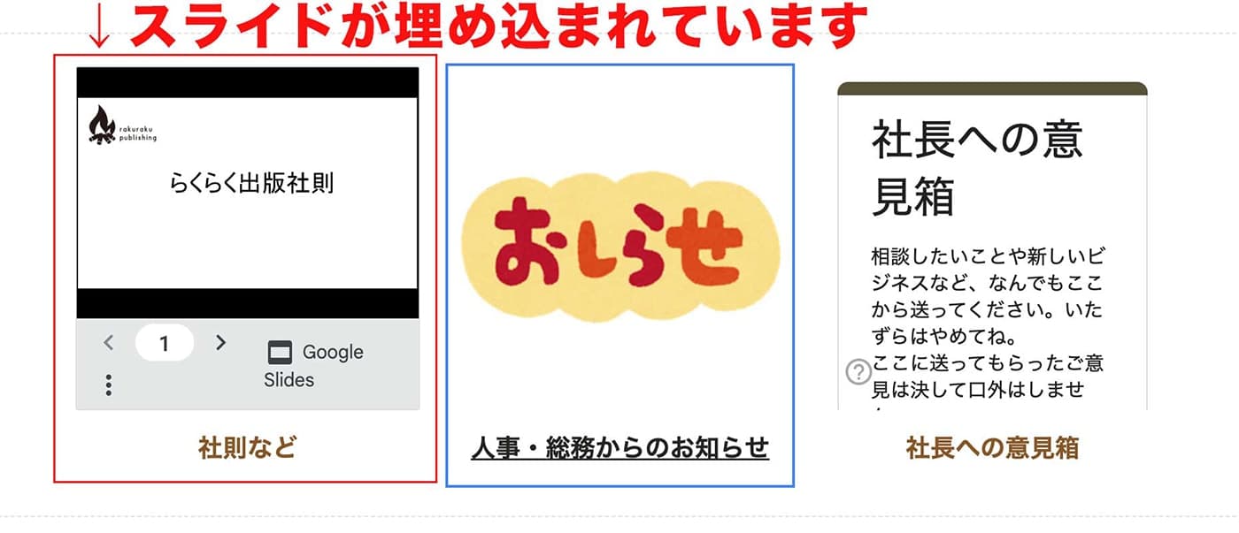 社内規程、マニュアル、会議資料、報告書などを Google ドライブに保存し、そのファイルを Google サイト内に直接埋め込むことができます。