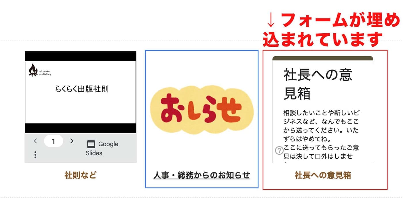 経費精算、休暇申請、備品購入申請などの Google フォームをサイトに埋め込み、社員が簡単にアクセスできるようにします。