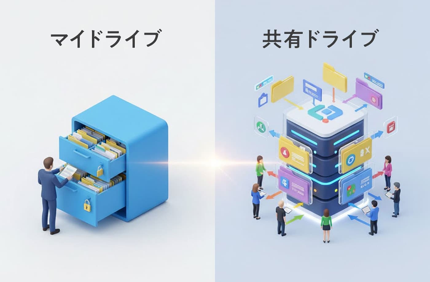 マイドライブは 「個人作業場」 、共有ドライブは 「会社の資産」 ですね。