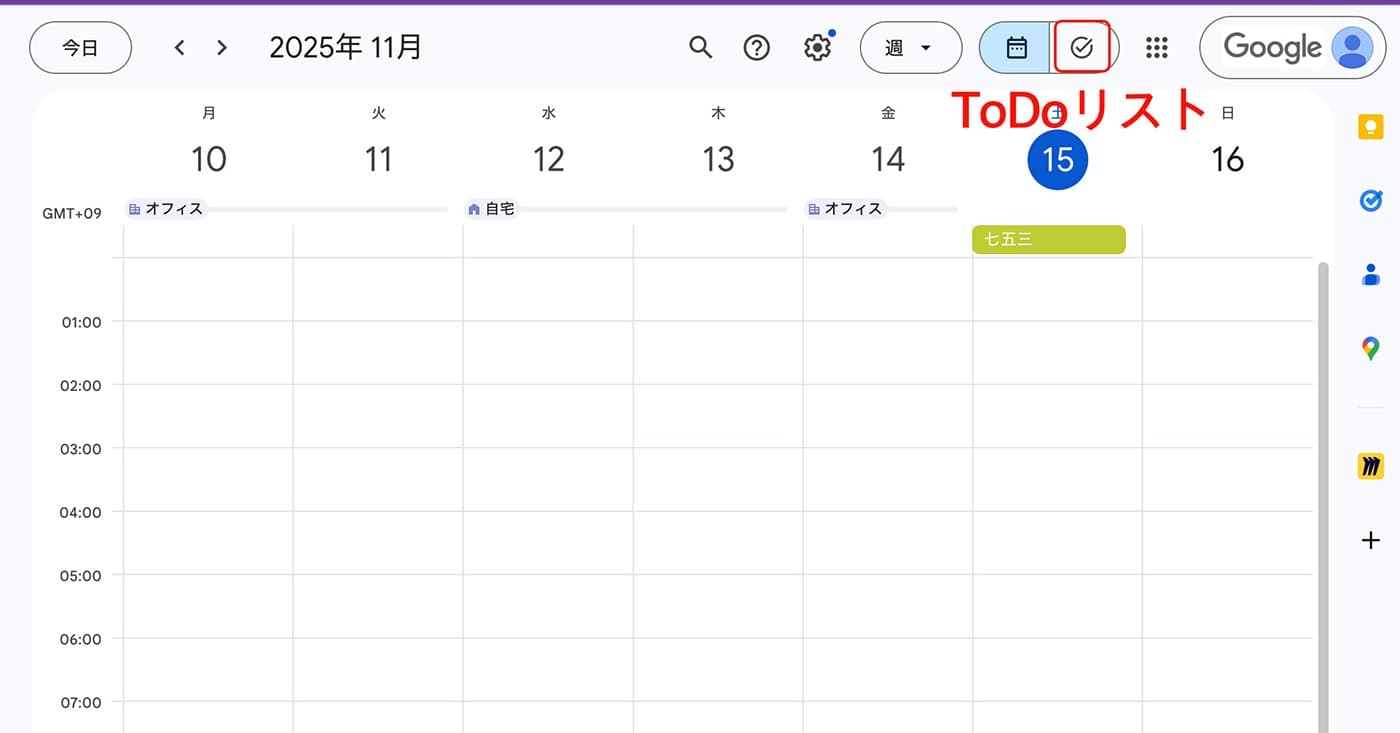 Google カレンダーにタブが表示されている 「ToDo リスト」 を使えば、カレンダーを見ながら 「いつまでに何をやるか」 を完結して管理できます。