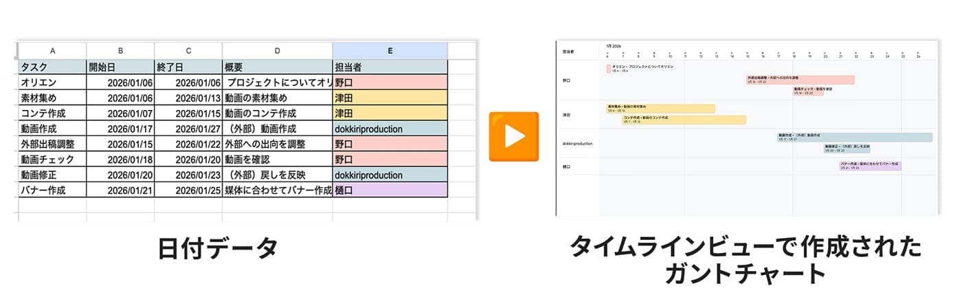 また、タイムラインビュー機能を利用すれば、入力された日付データをもとに、スプレッドシートが自動でガントチャート形式のタイムラインビューを生成するのでとても便利ですよ。
