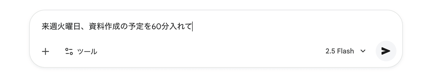 ここでは例として 「来週火曜日、資料作成の予定を60分入れて」 というプロンプトを入れました。