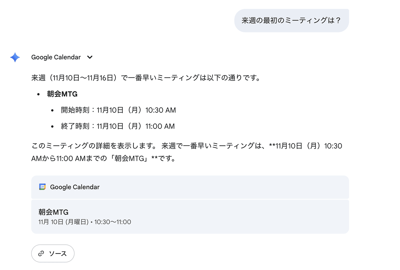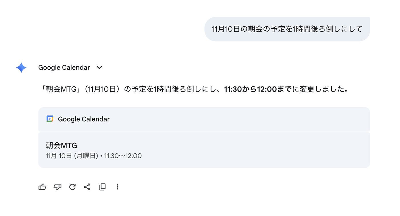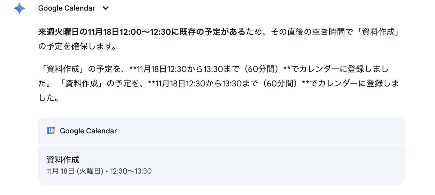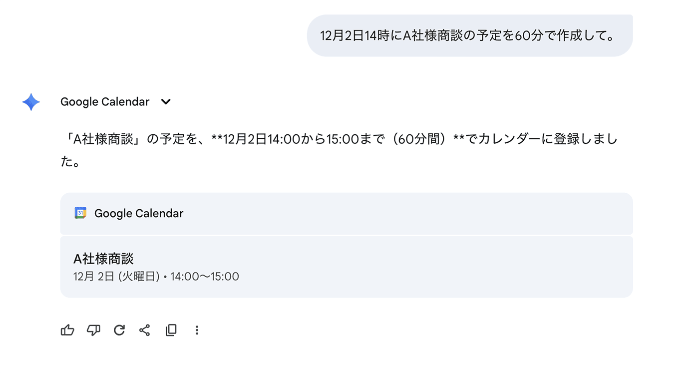 - Gemini に、Google カレンダーの予定の作成や表示を自然言語でリクエストします。
