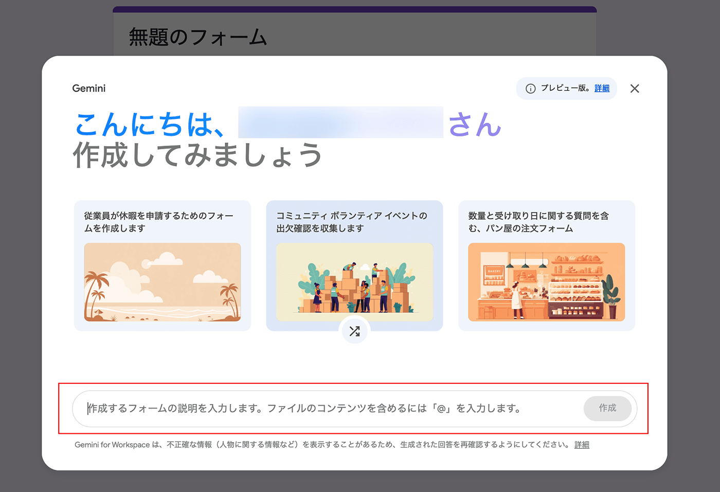 なお、フォーム作成サポート機能は、 Google Workspace Business Standard 以上のユーザーまたは Gemini アドオンライセンス(Gemini Business / Enterprise / Education)を保有しているユーザーが利用可能です。