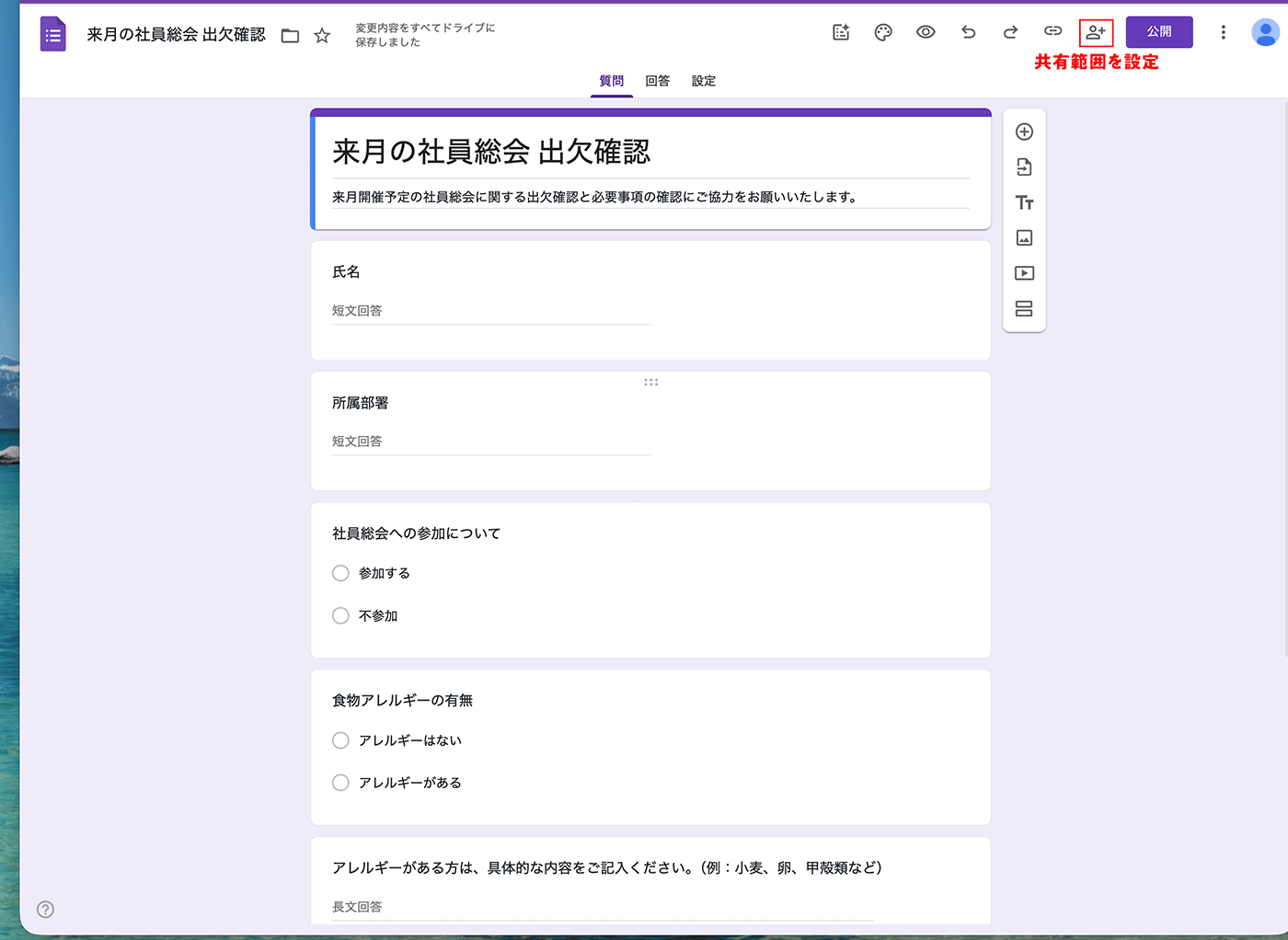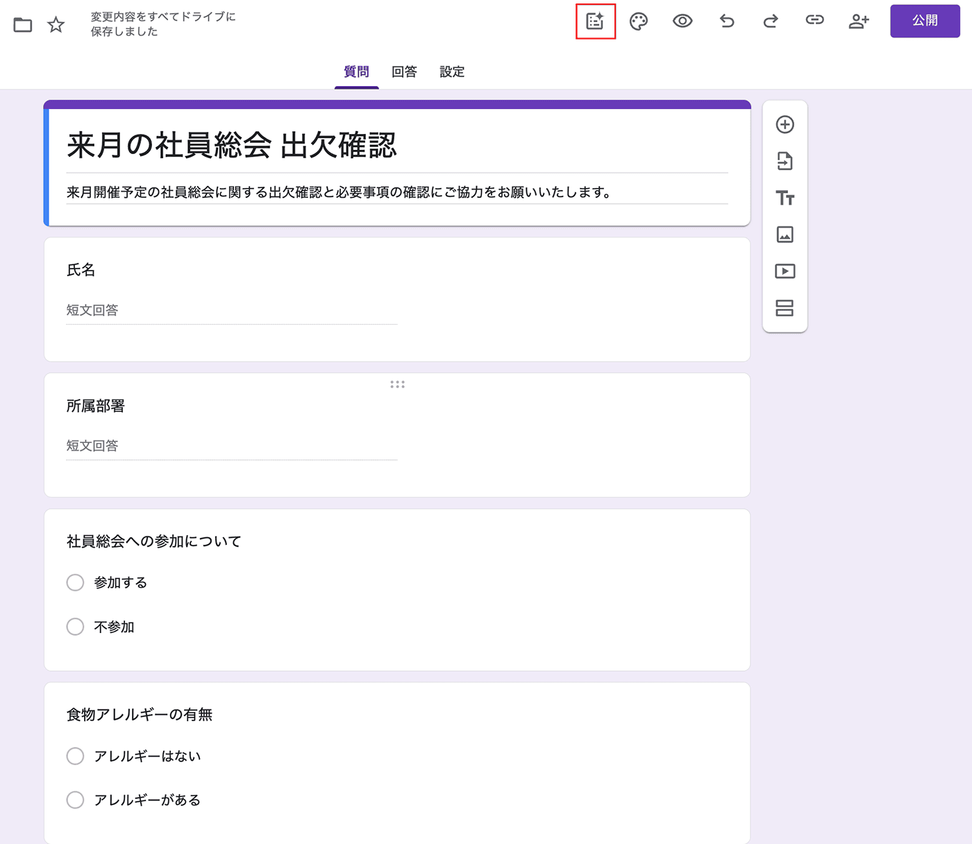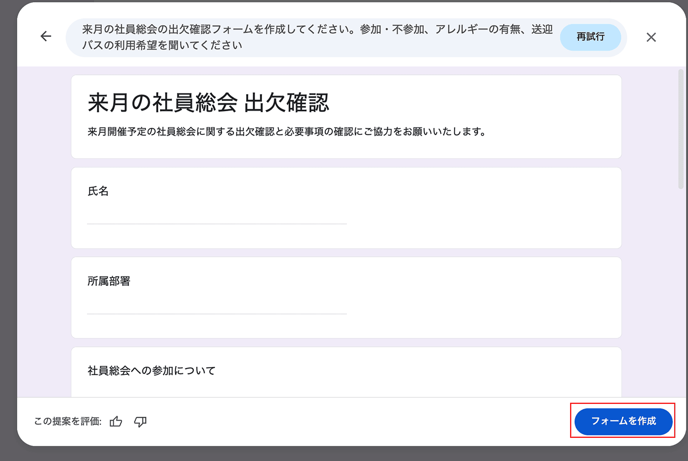 ここでは、 「来月の社員総会の出欠確認フォームを作成してください。参加・不参加、アレルギーの有無、送迎バスの利用希望を聞いてください」 と入力します。