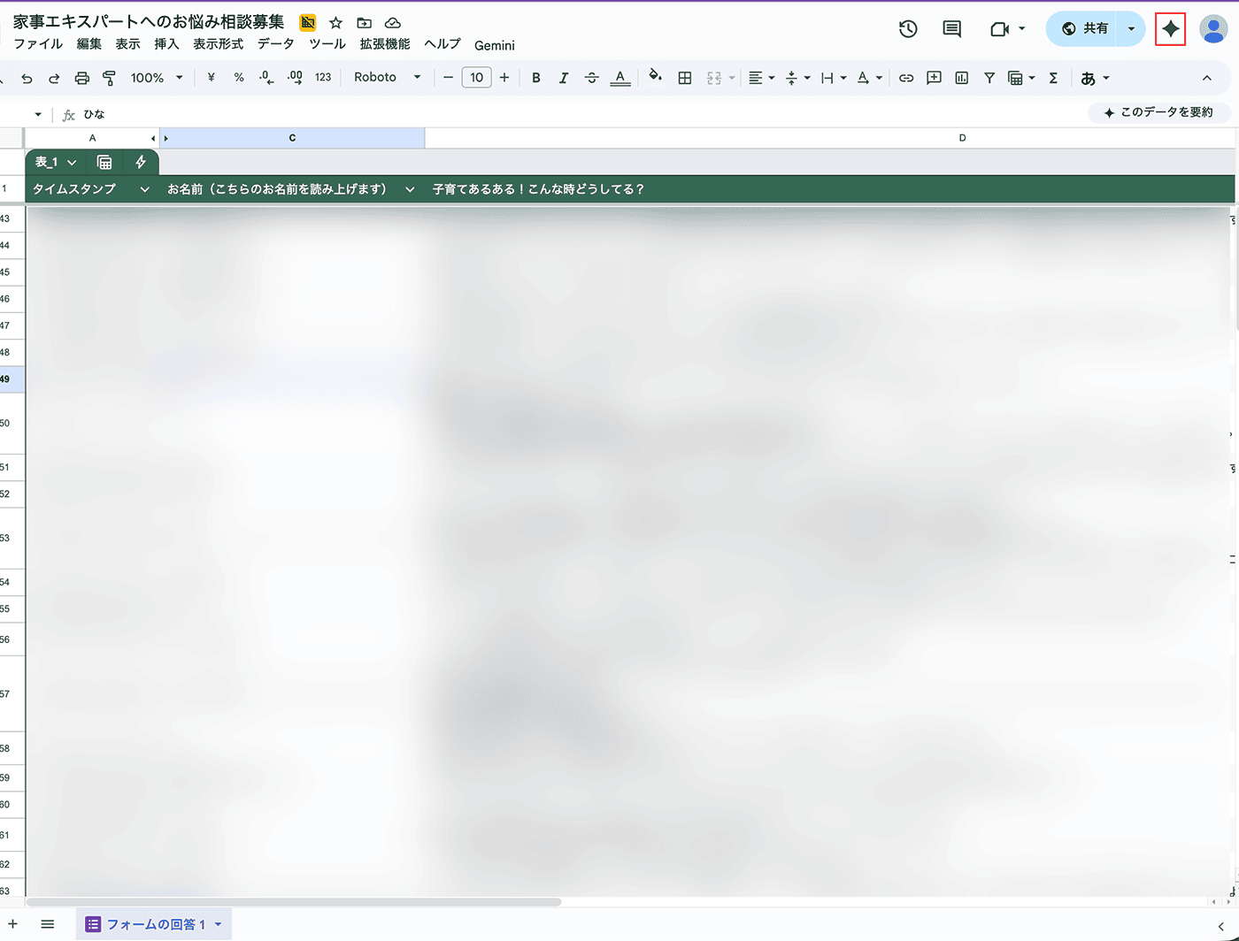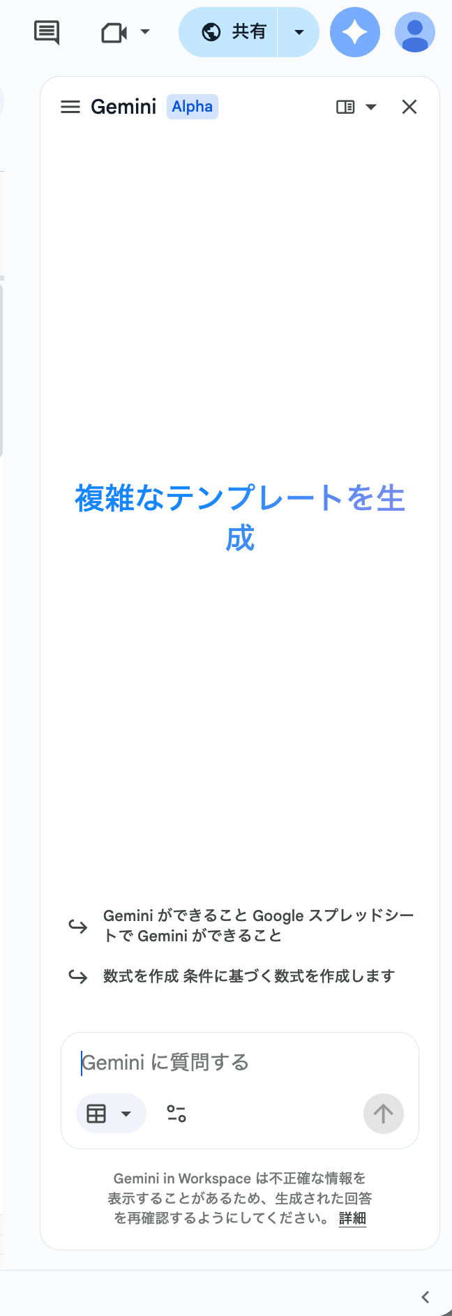 - スプレッドシート上で Gemini を使うには、右上の Gemini アイコンをクリックします。