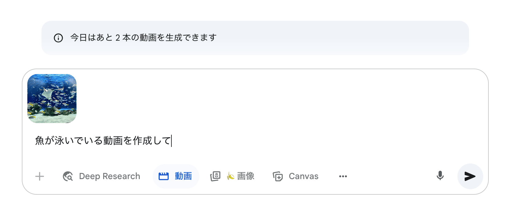 - Gemini アプリを開いてプロンプトを入れる枠の中にある 「動画」 のアイコンをクリックします。
