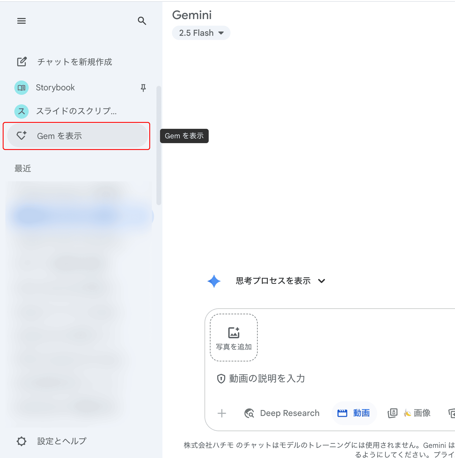 - Gemini の左のパネルから [Gemを表示] をクリックします。