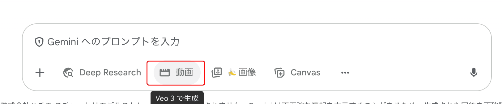 - Gemini アプリを開いてプロンプトを入れる枠の中にある 「動画」 のアイコンをクリックします。