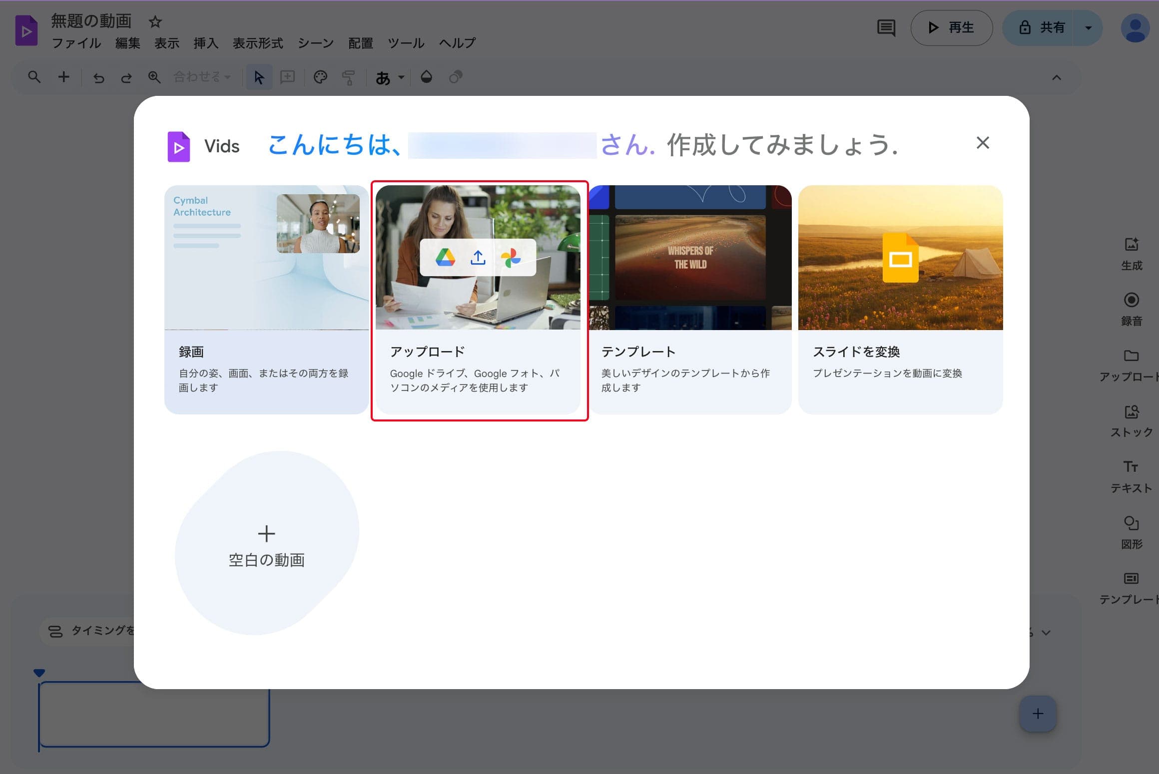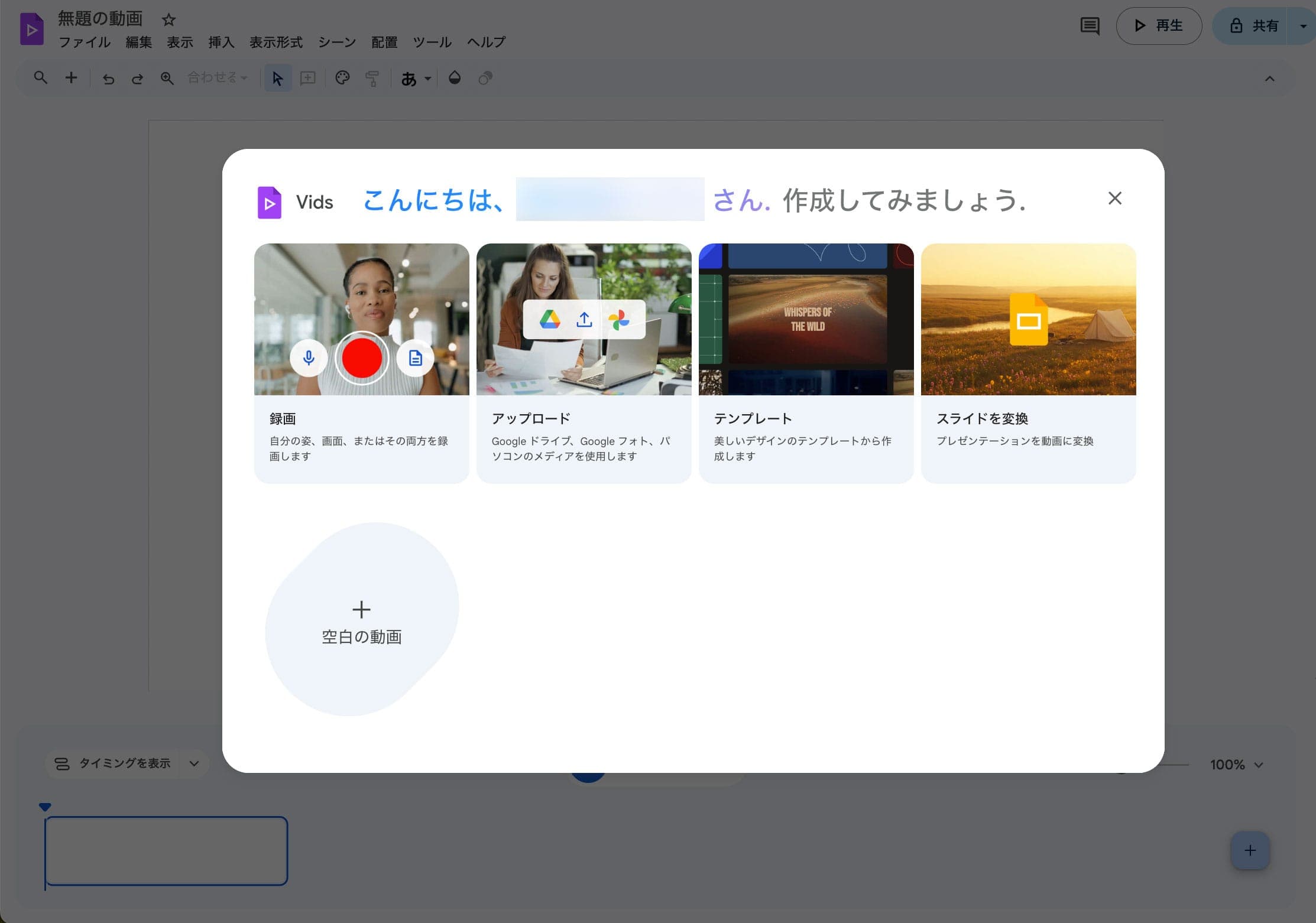 Google Vids を始めるには、対応するエディションのアカウントにログインしてパソコンで Google Vids を開くと、下記のような画面が表示されます。