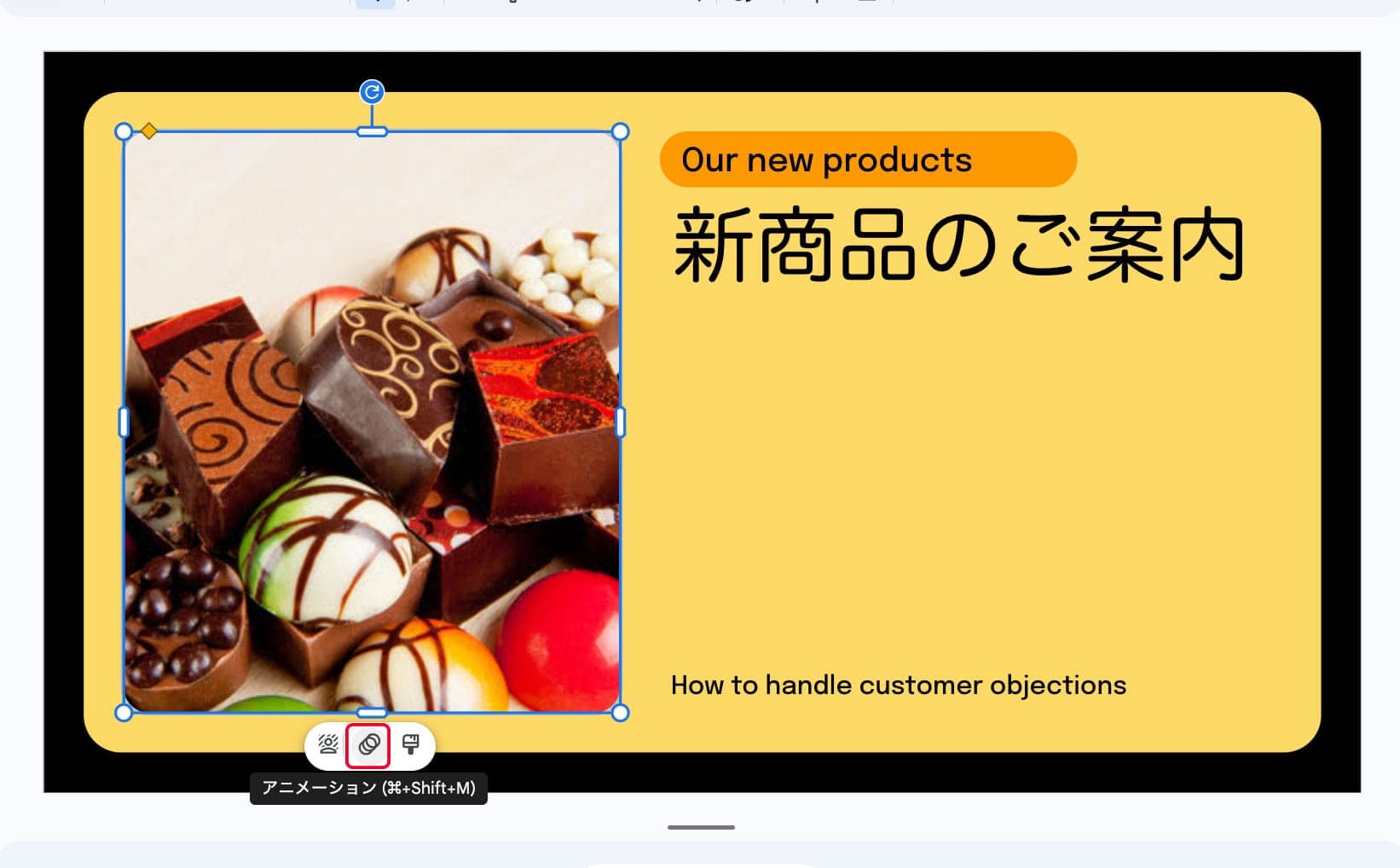 画像などにアニメーションをつけたい場合はオブジェクトを選択し、表示される [アニメーションを変更] アイコンをクリックします。