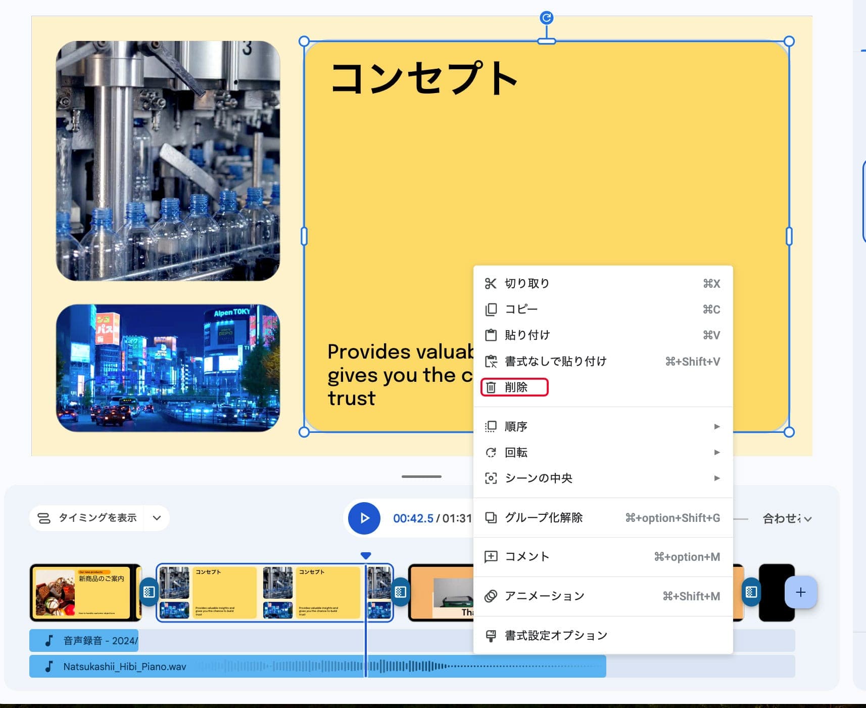 シーンを追加や不要なシーンを削除するには、下のタイムラインで不要なシーンを選択し、右クリックから 「削除」 を選択します。