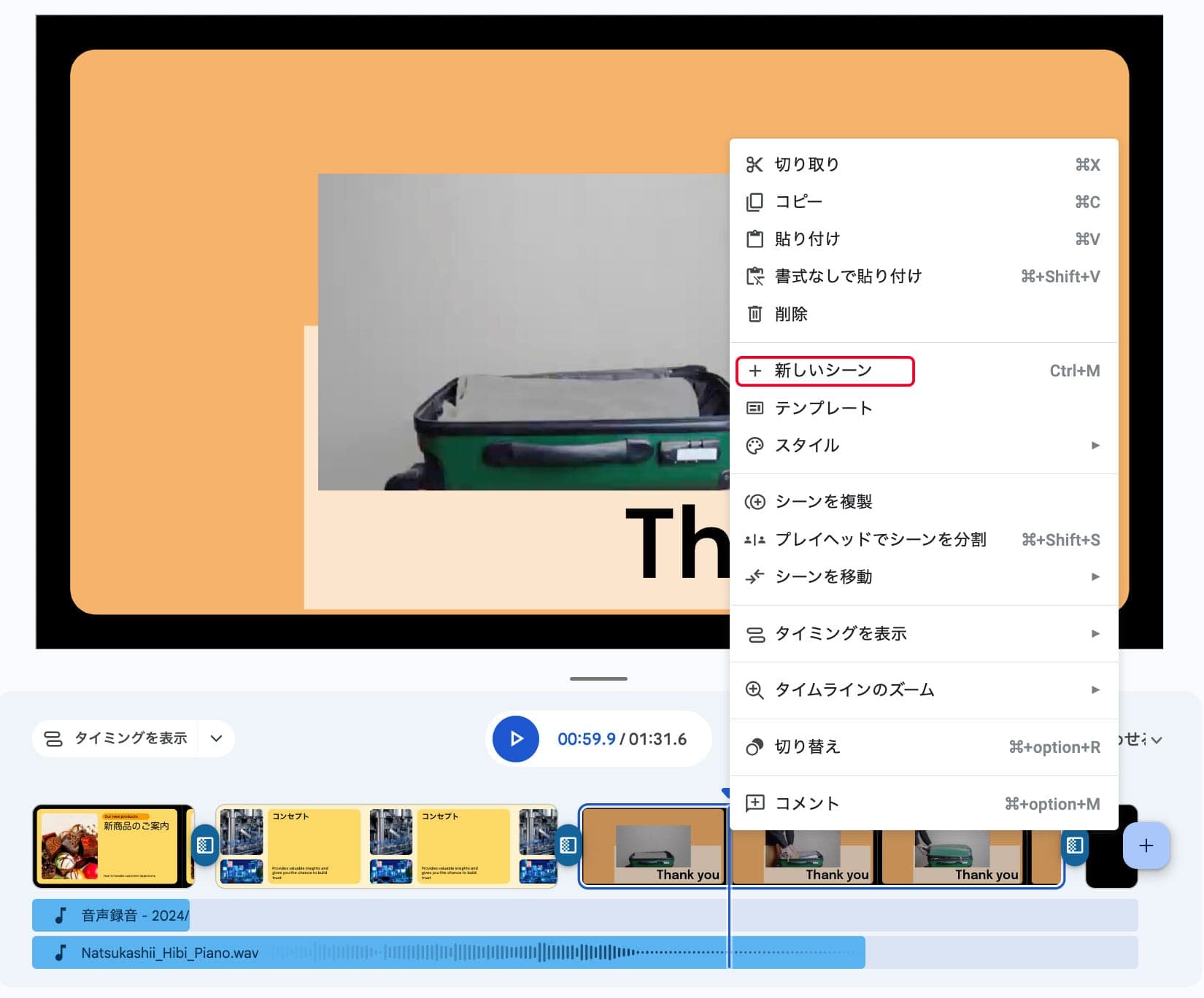 シーンを追加するには、タイムラインでシーンをいれたい箇所を右クリックし、 「新しいシーン」 を選択してください。