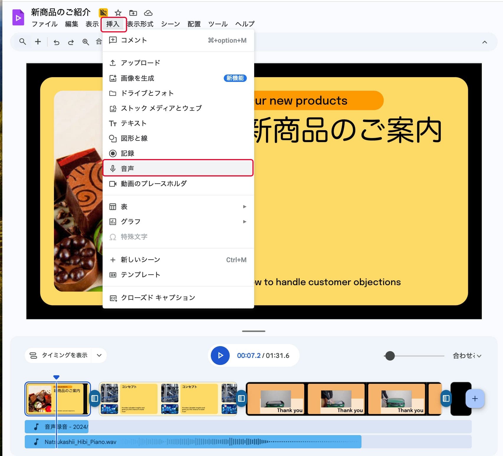 - 上メニューの 「挿入」 から 「音声」 を選択します。