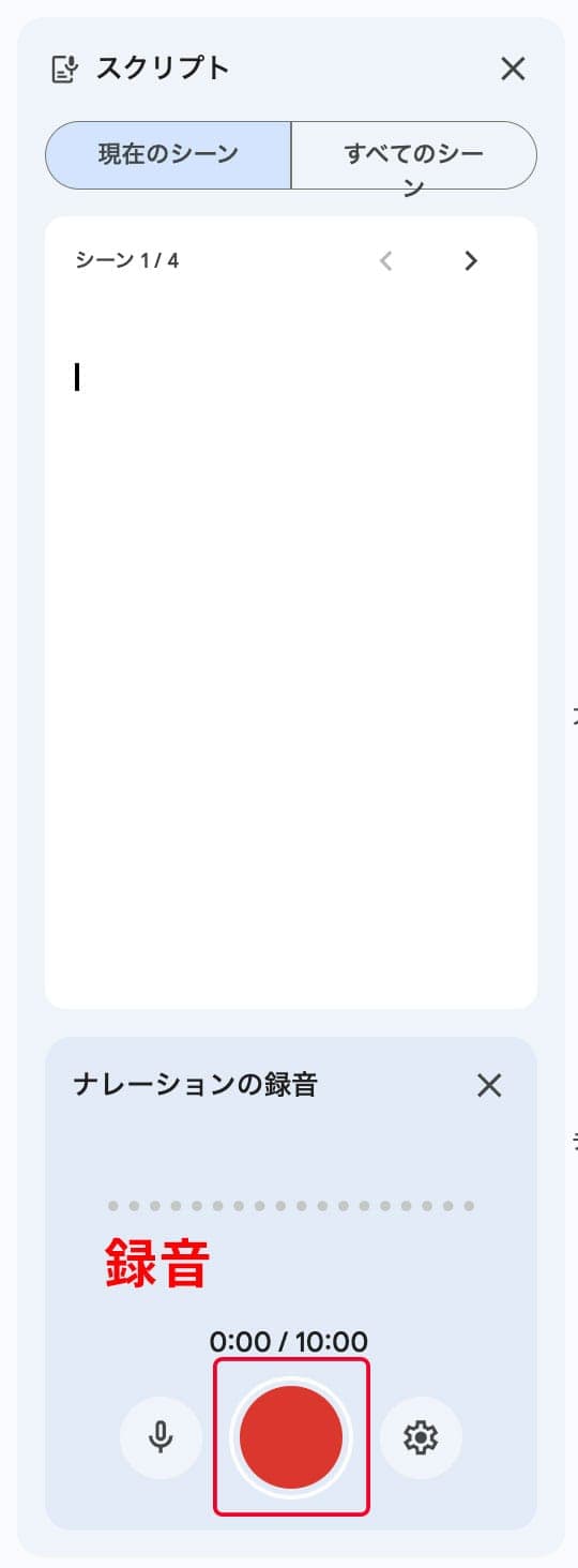 - 下の録音ボタンを押すと、ナレーションの録音が開始されます。