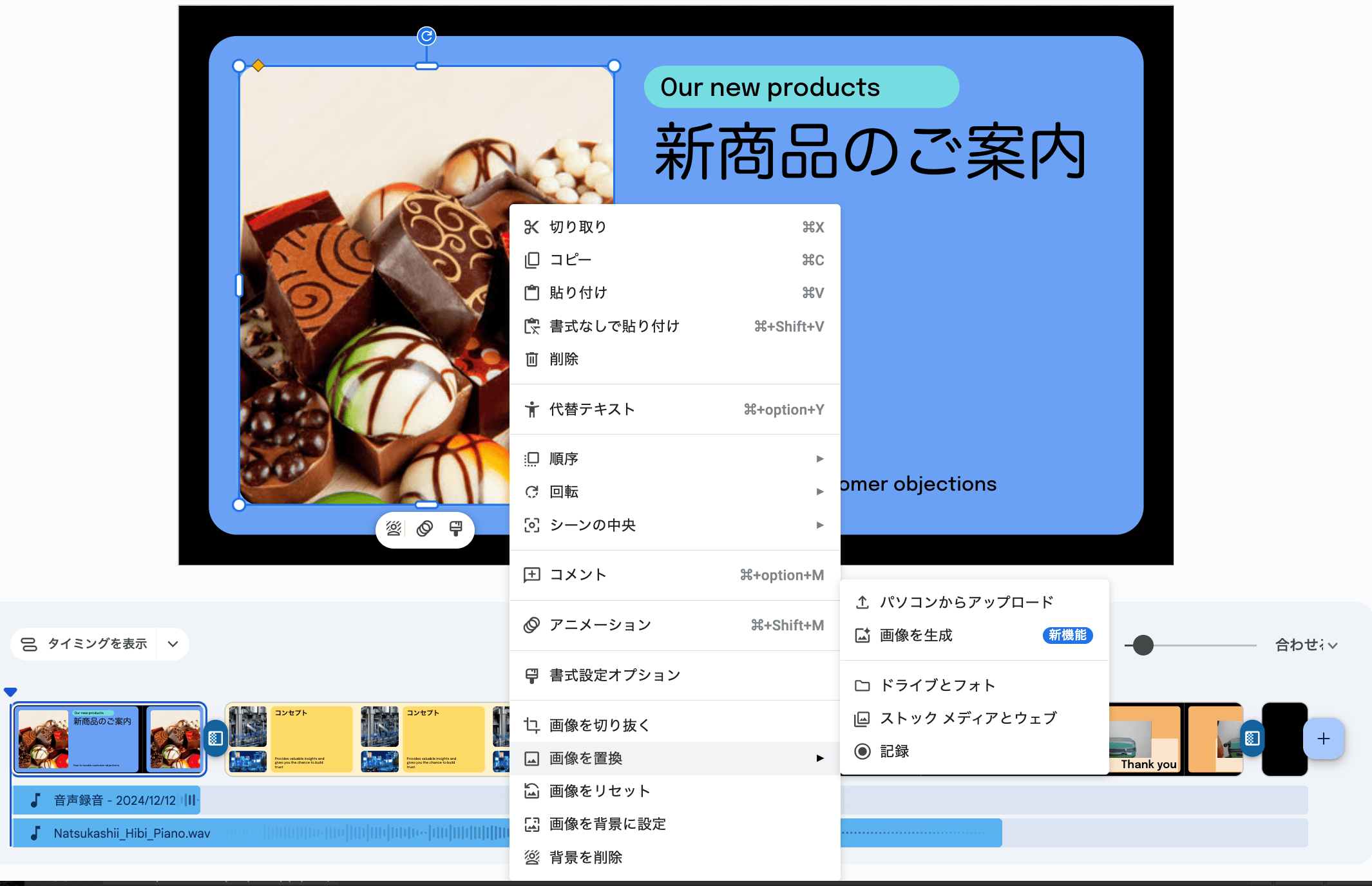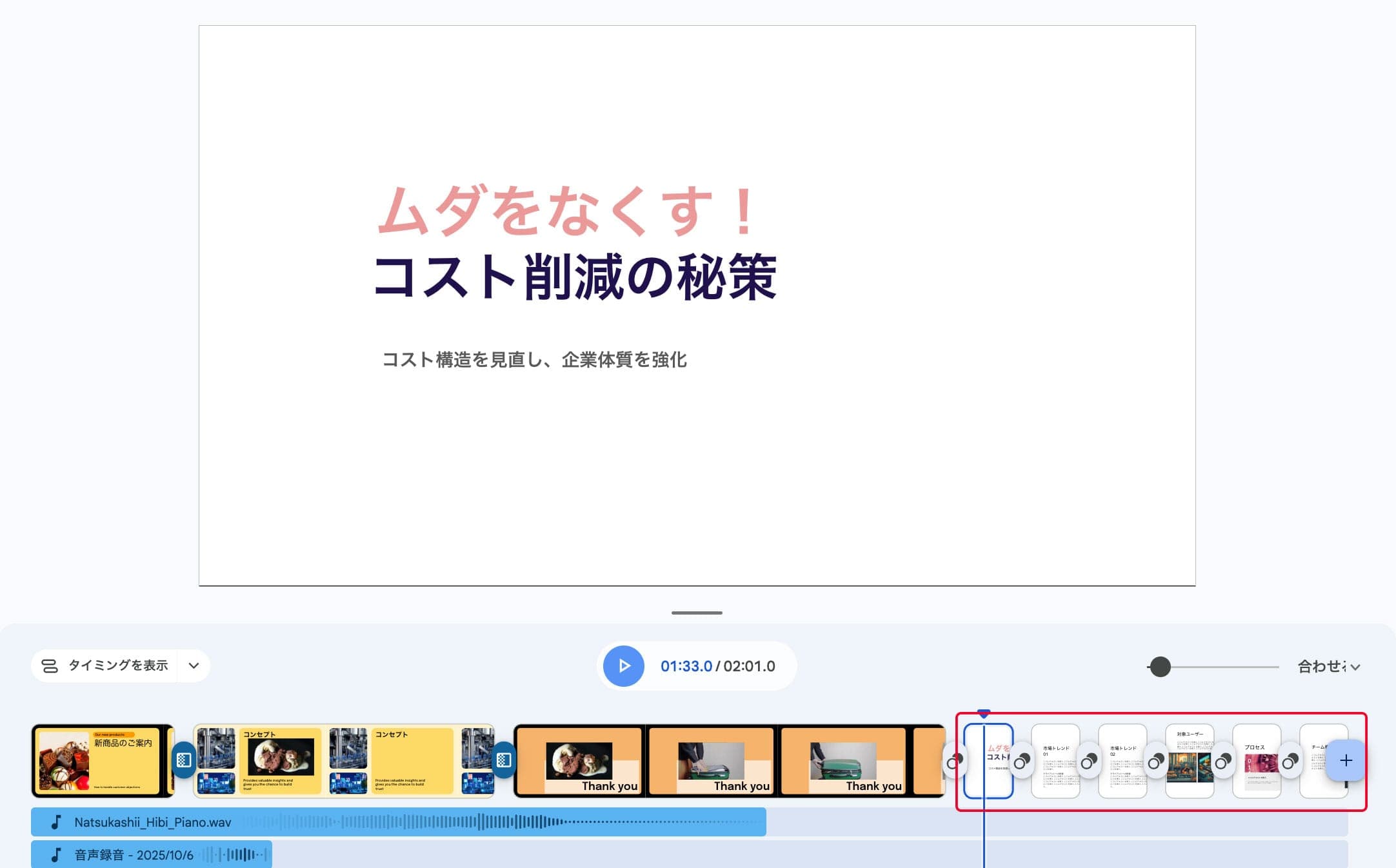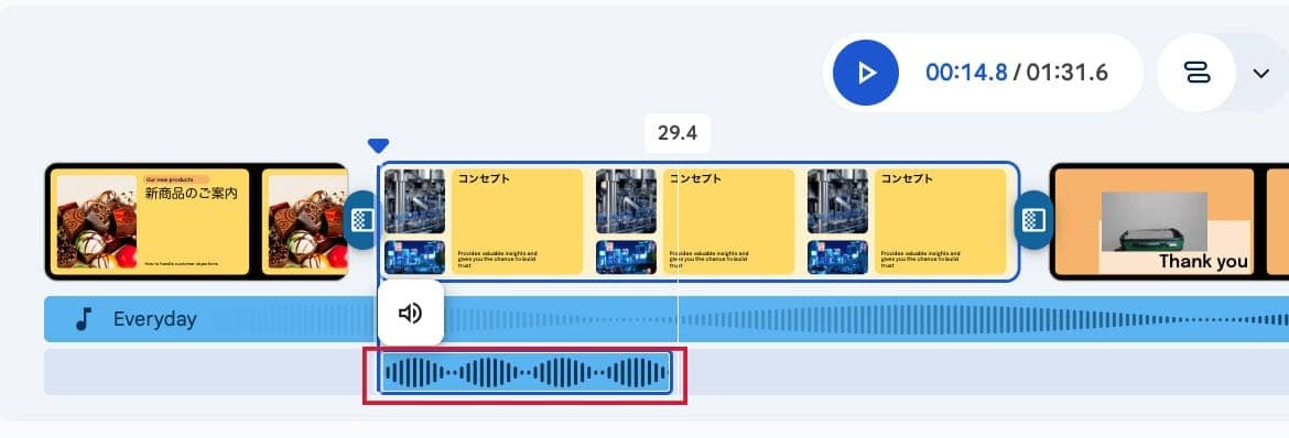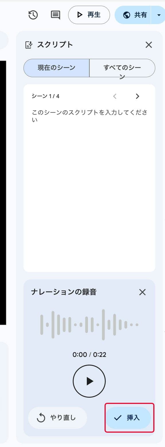 重要 : AI によるナレーションの自動生成は、2025年10月現在英語でのみご利用いただけます。ここでは、自分で録音した音声を挿入する方法を紹介します。