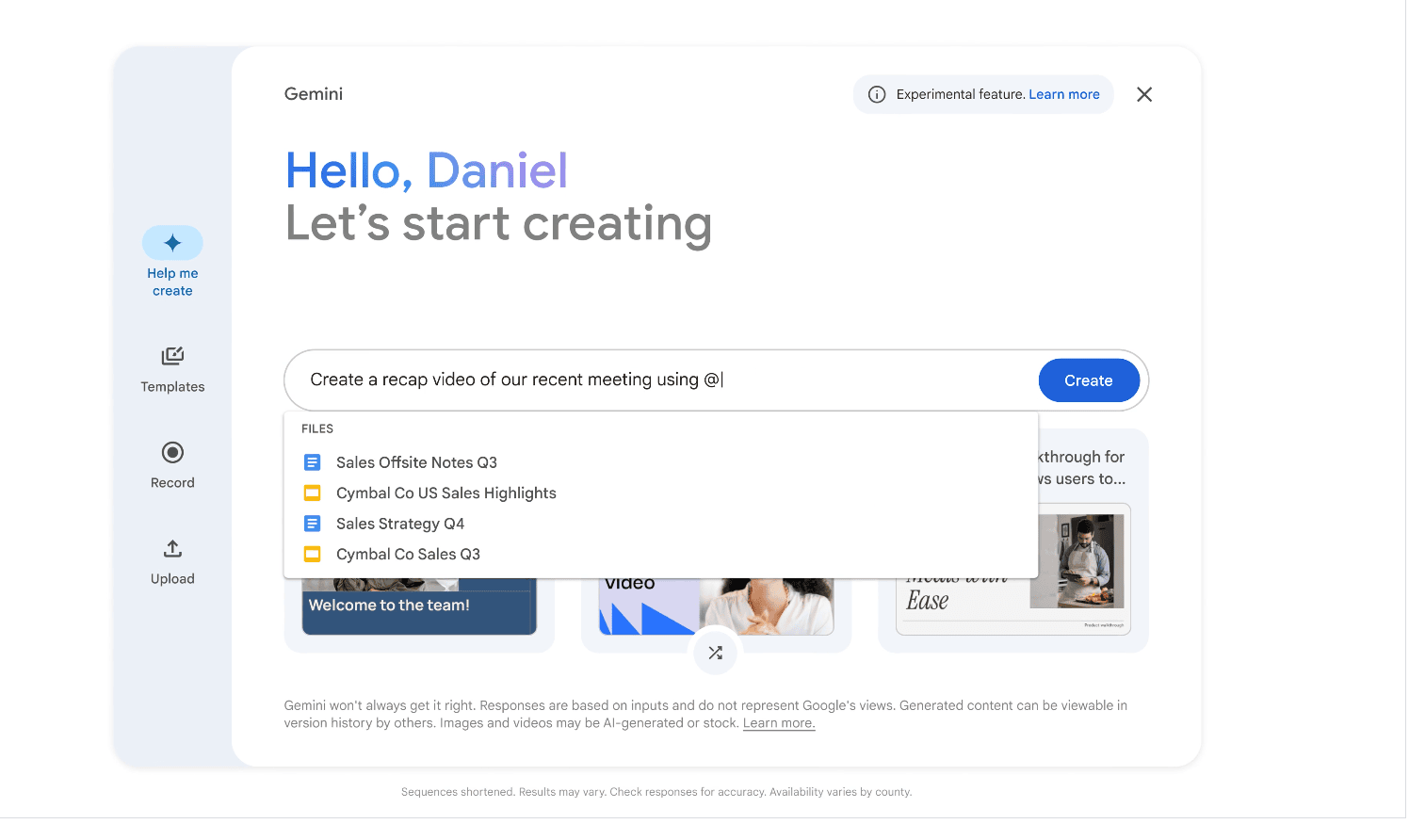 Google Vids は Google Workspace とシームレスに連携します。 Google ドキュメントや Google スライド といった既存のファイルを読み込ませることで、その内容に基づいて動画を生成することが可能です。