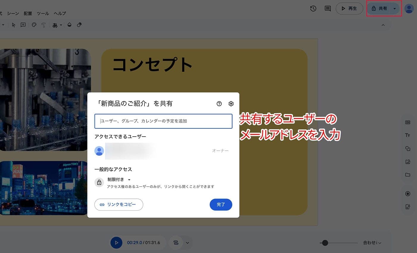 他の Google Workspace のアプリと同様に右上の 「共有」 をクリックし、共同編集を行うユーザーのメールアドレスを入力の上、編集または閲覧権限を付与してください。