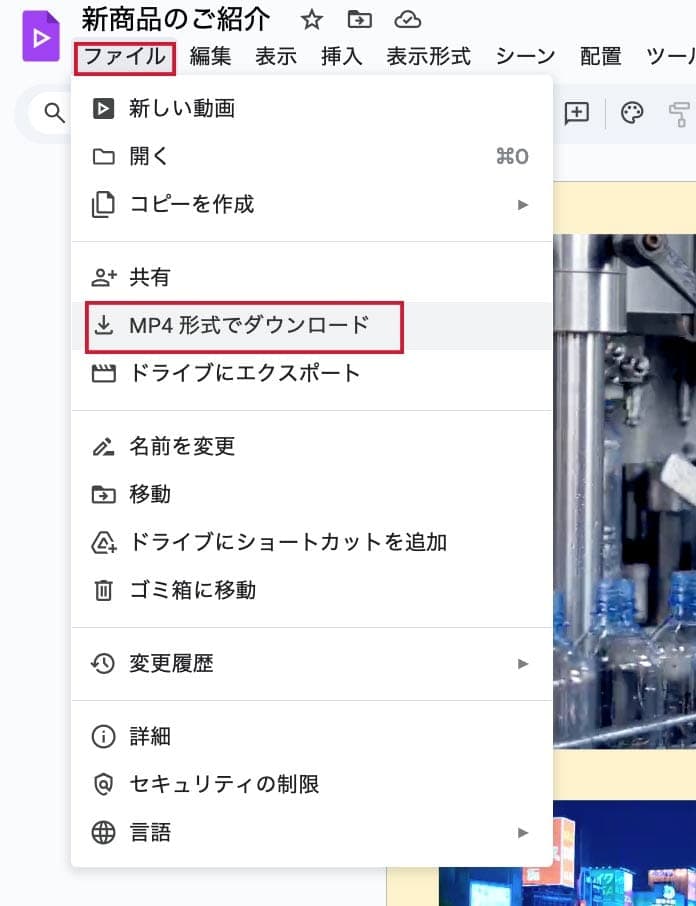 作成した Vids は MP4 に書き出せます。書き出すには、上メニューの 「ファイル」 > 「MP4 形式でダウンロード」 を選択してください。