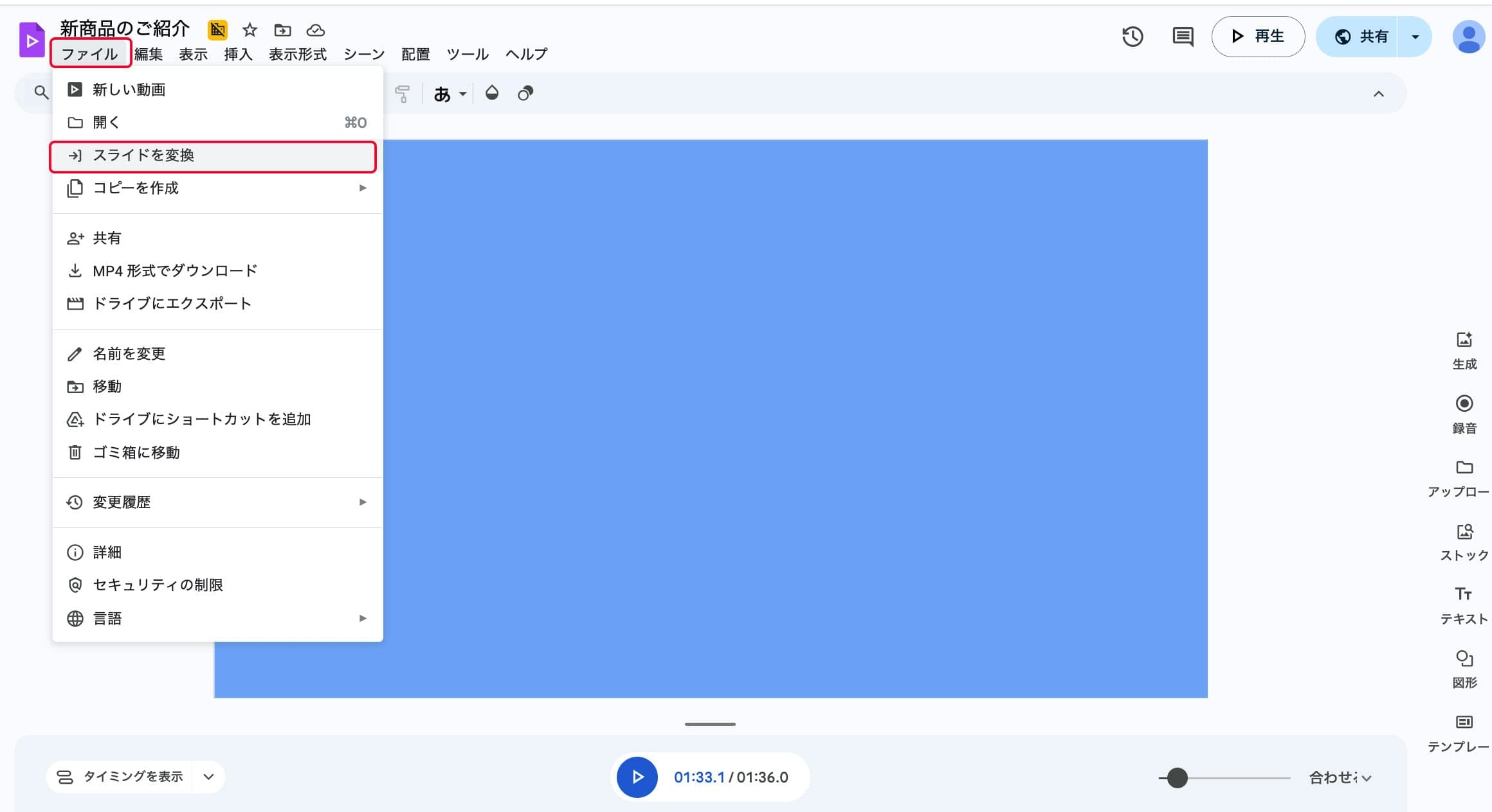 Google スライドのプレゼン資料を、クリック一つで動画に変換できます。 - Google ドライブ連携