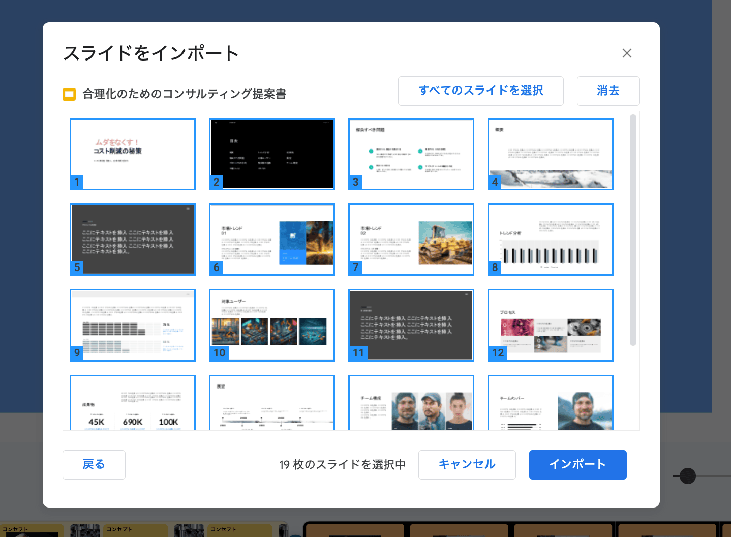 - 動画に変換したいスライドのページを選択し、 「インポート」 をクリックします。