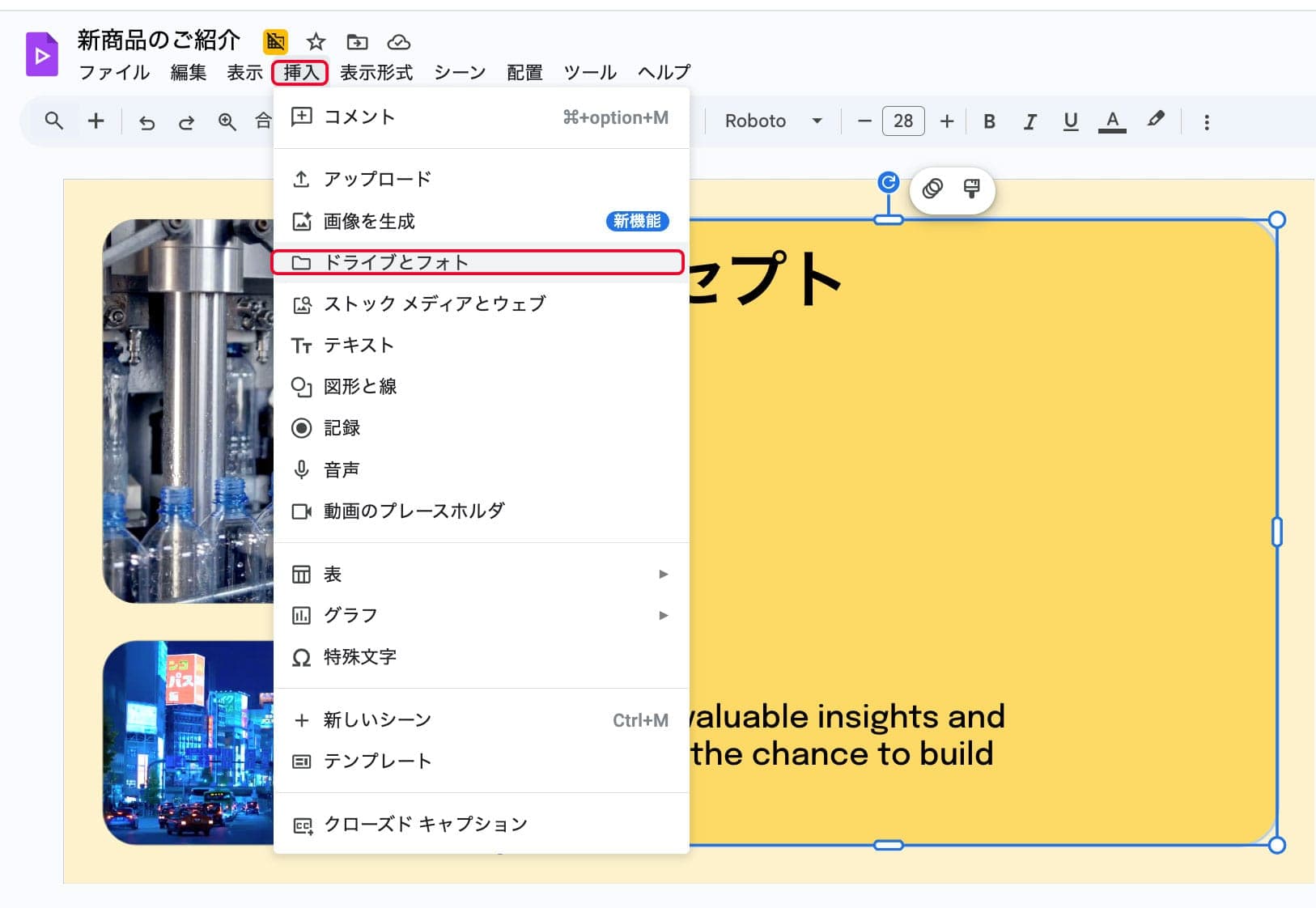 動画や画像を追加したい場合は、追加したいシーンで上メニューの 「挿入」 > 「ドライブとフォト」 を選択します。