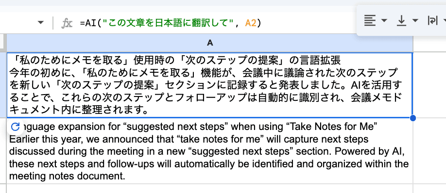 スプレッドシートの AI 関数を利用すれば、長文の要約やデータの分類や数式の生成などが自然言語での簡単な指示だけで完了できるようになります。