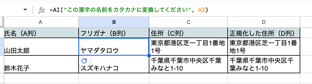 AI 関数を使えば、氏名や住所のデータの正規化を簡単に行うことができます。