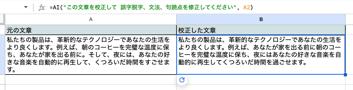 =AI(“この文章を校正して。誤字脱字、文法、句読点を修正してください。”, A1)