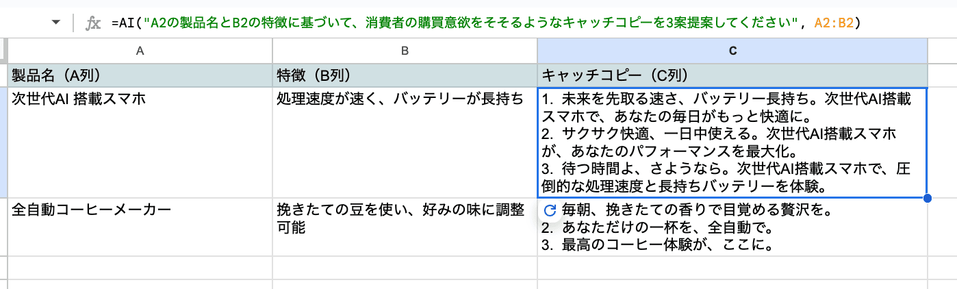 =AI(“A2の製品名とB2の特徴に基づいて、消費者の購買意欲をそそるようなキャッチコピーを3案提案してください”, A2:B2)