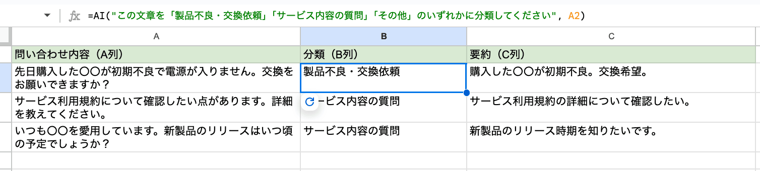 分類: =AI(“この文章を製品不良・交換依頼サービス内容の質問その他のいずれかに分類してください”, A2)