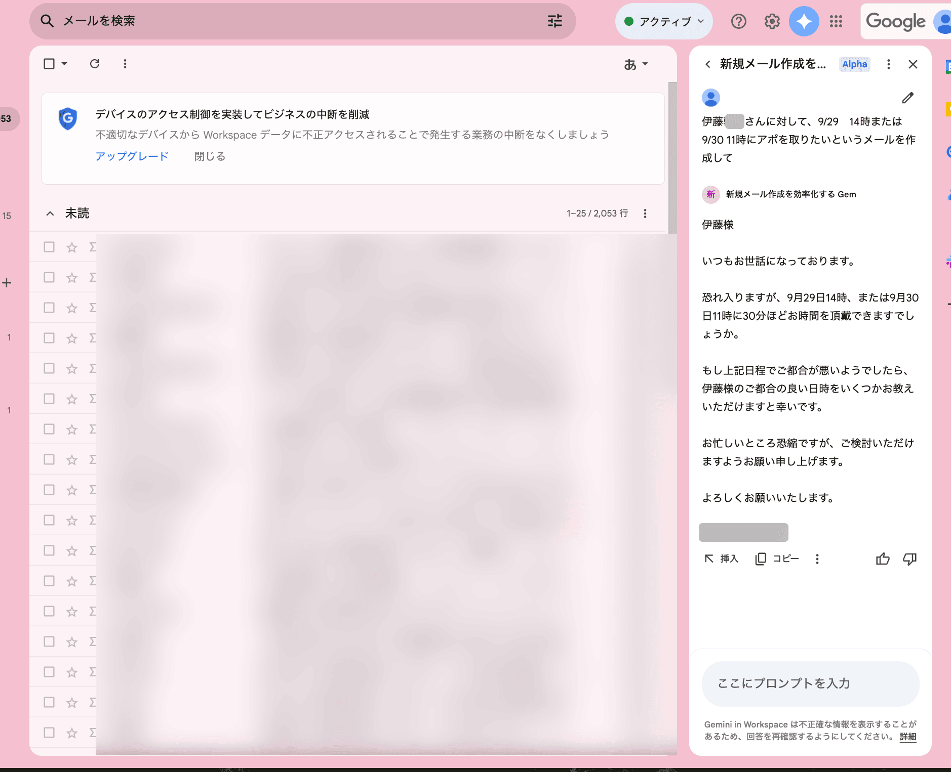 これにより、毎回同じプロンプトを入力する手間がなくなり、業務に特化した AI を必要な時にすぐに呼び出せるようになります。さらに、アプリの Gem サイドパネルを活用すれば、ページを切り替えることなく専門的な AI を呼び出せるので、より集中して文章作成や情報整理を行うことが可能となります。
