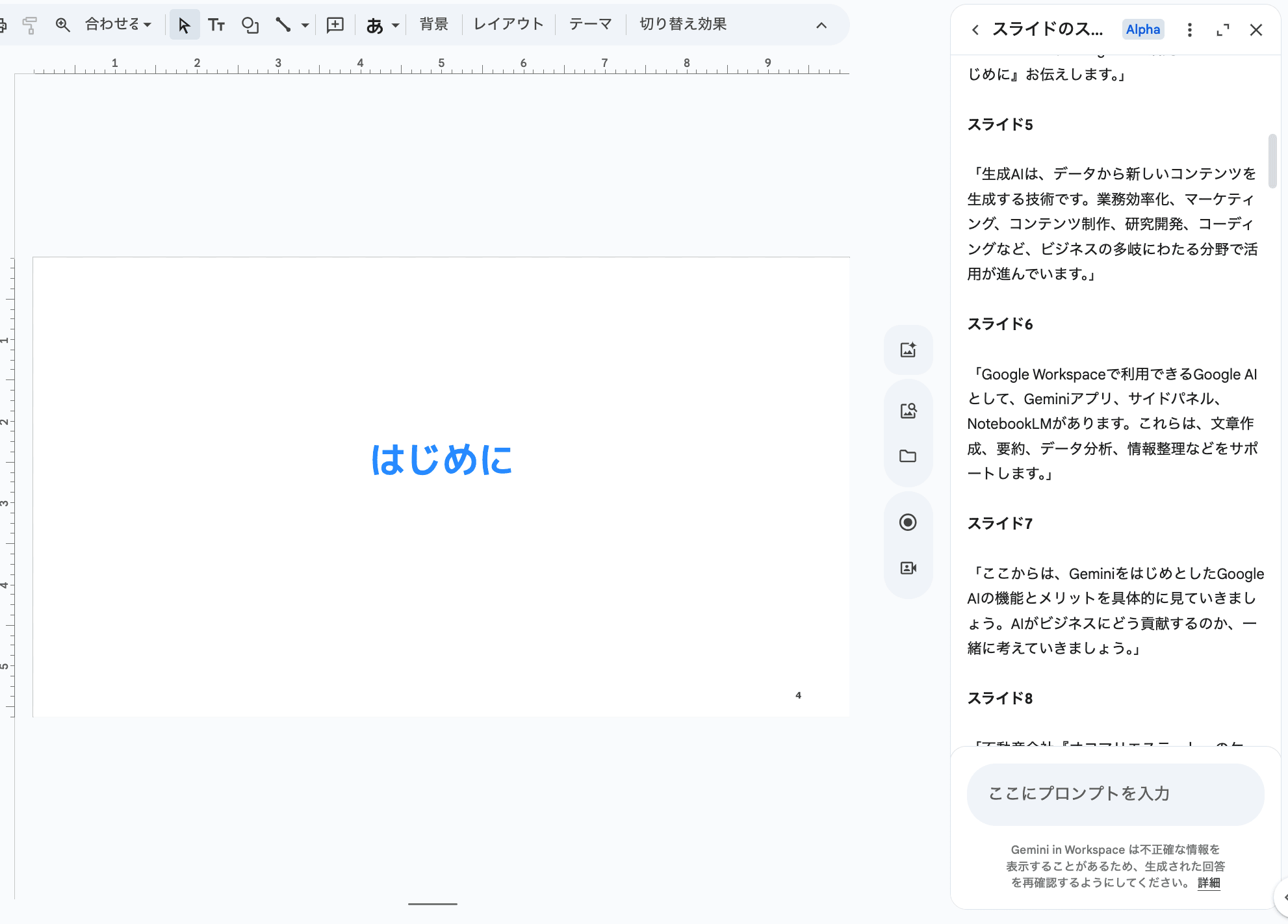 Google スライドの Gem サイドパネルは、プレゼン資料の構成や内容作成をサポートします。