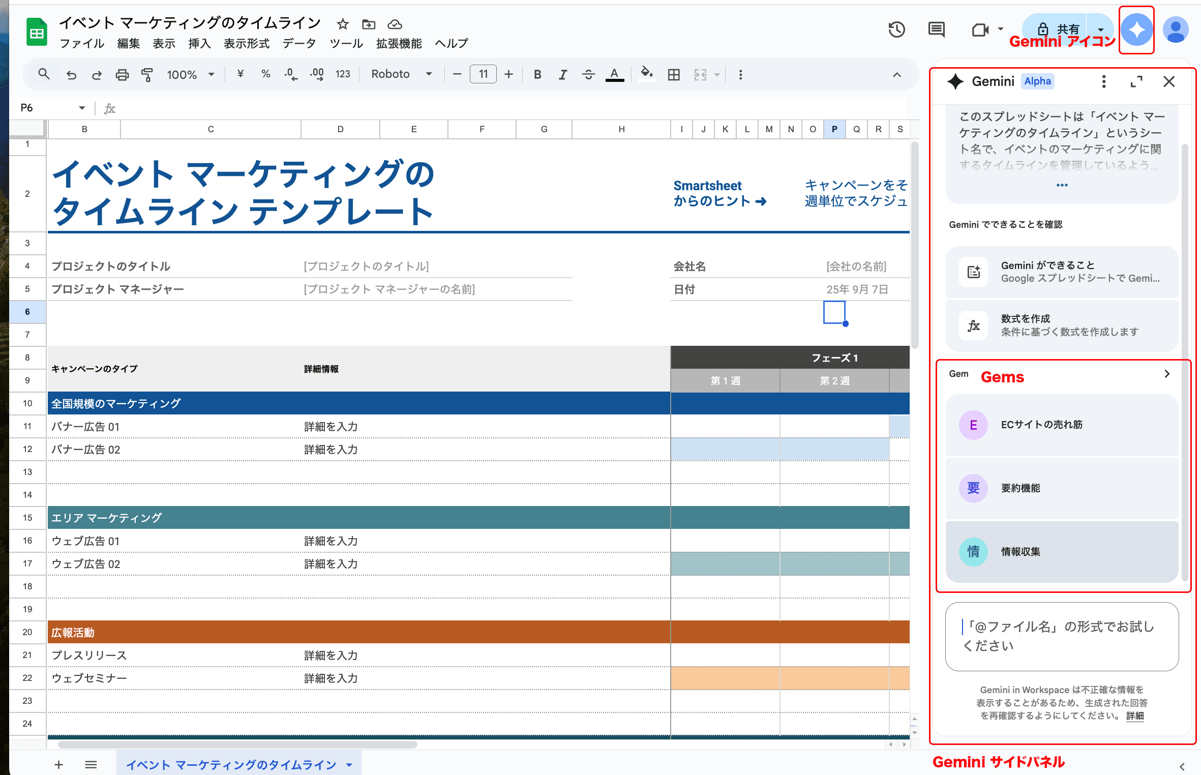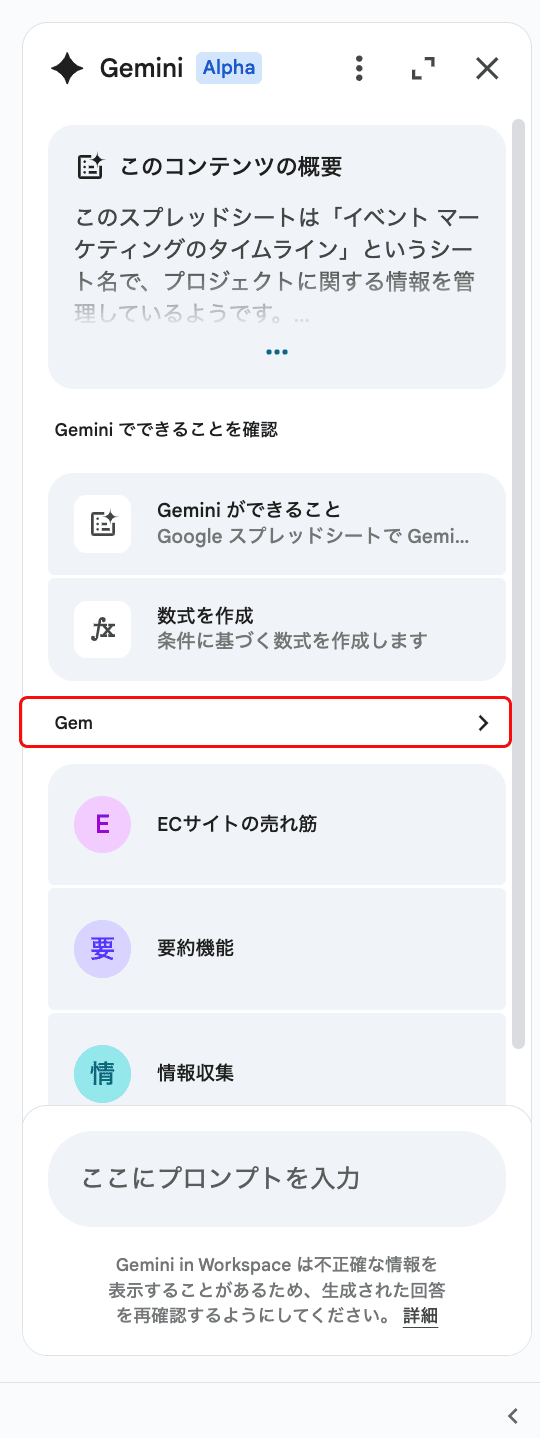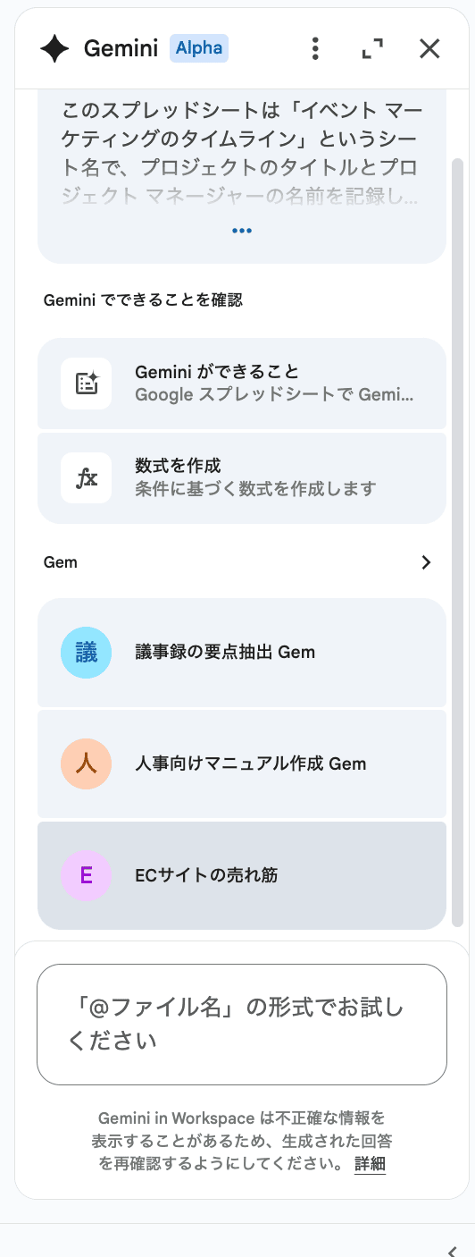 2025年9月現在、 Google スプレッドシート、ドキュメント、 Gmail、スライド、ドライブ で Gem サイドパネルが利用可能です。