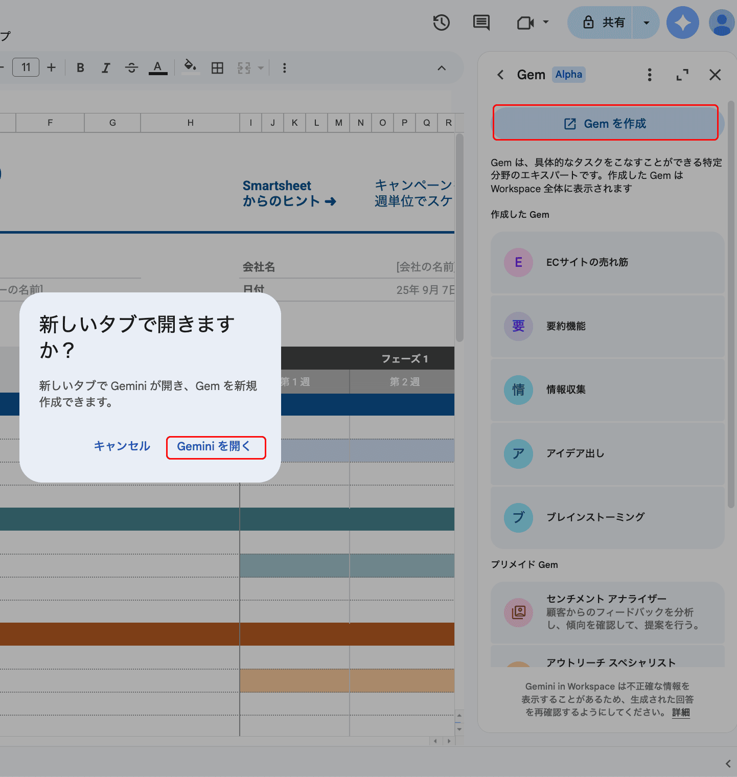- 「Gem を作成」 というボタンをクリックし、ポップアップで 「Gemini を開く」 をさらにクリックすると新しいタブで Gemini アプリが開きます。