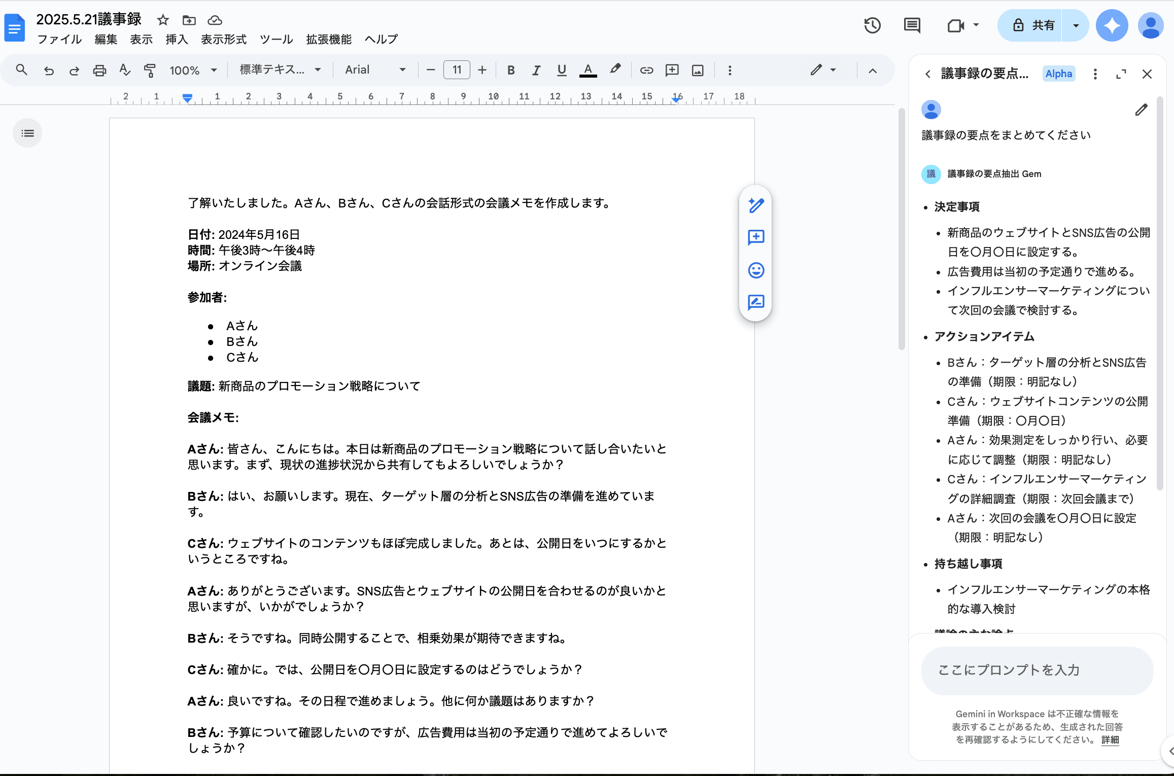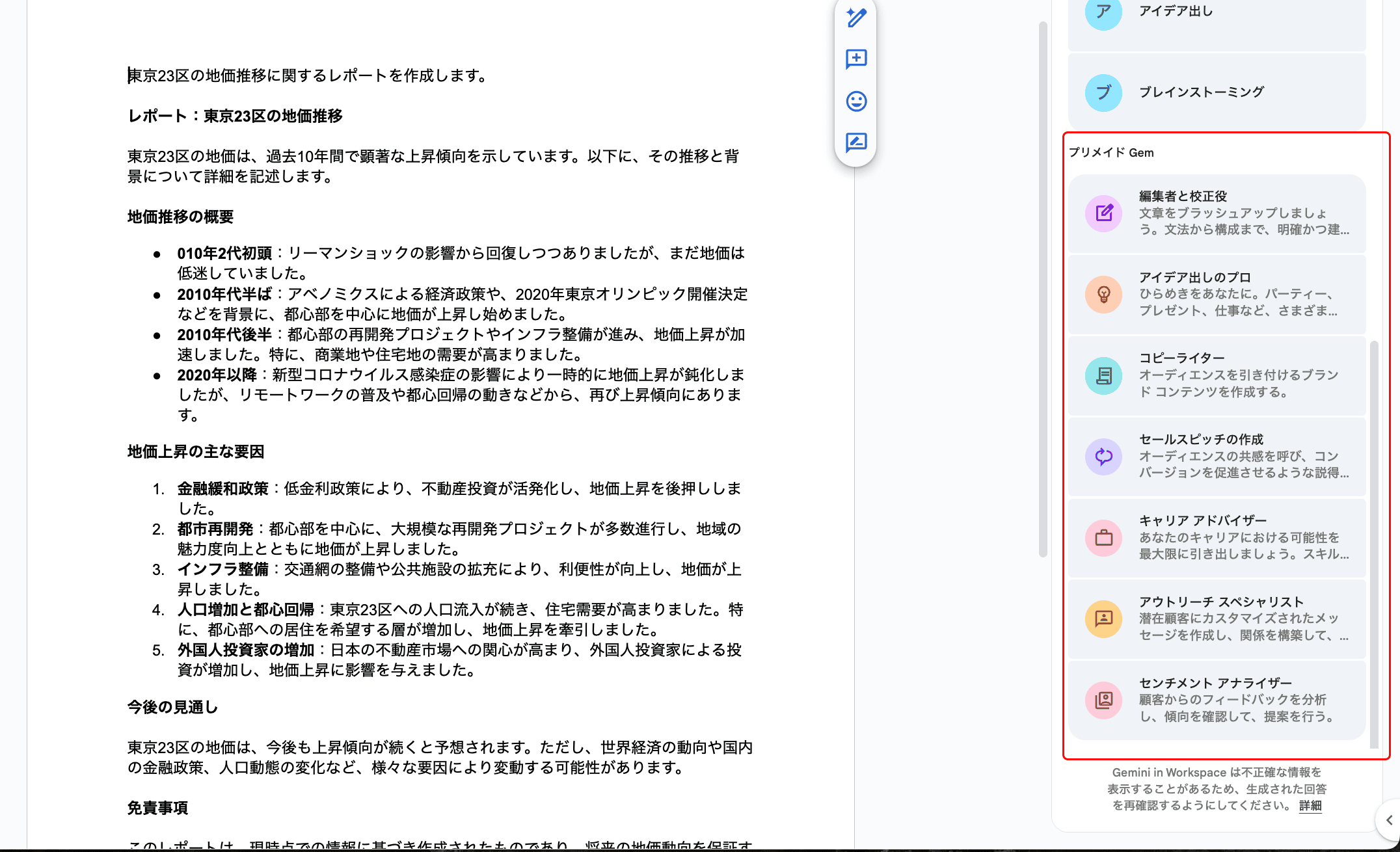 Google ドキュメントは、企画書、レポート、議事録、ブログ記事など、さまざまなオフィス文章作成に利用されています。 Gem を活用することで、文章の作成、推敲、校正といったプロセスの効率化に役立ちます。