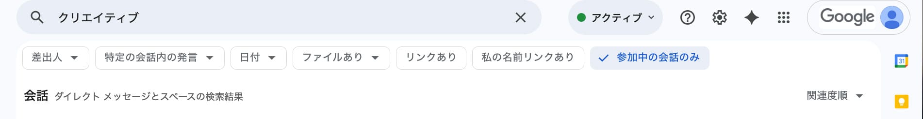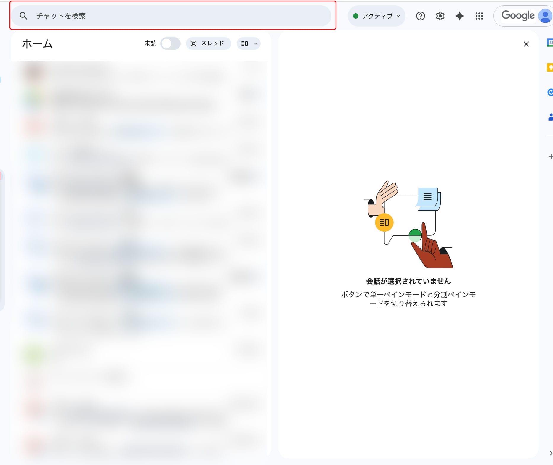 Google Chat には Google ならではの便利な検索機能があります。 Google Chat 上部に表示されてる 「チャットを検索」 の枠に検索を行いたいユーザーやメッセージ、あるいはファイル名などを入力すると即座に候補が表示されます。また、この検索機能ではファイル内のコンテンツのキーワードも検索することが可能です。