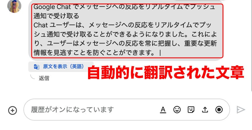 自動翻訳機能を利用するには、一度 Google Chat の再読み込みを行ってください。