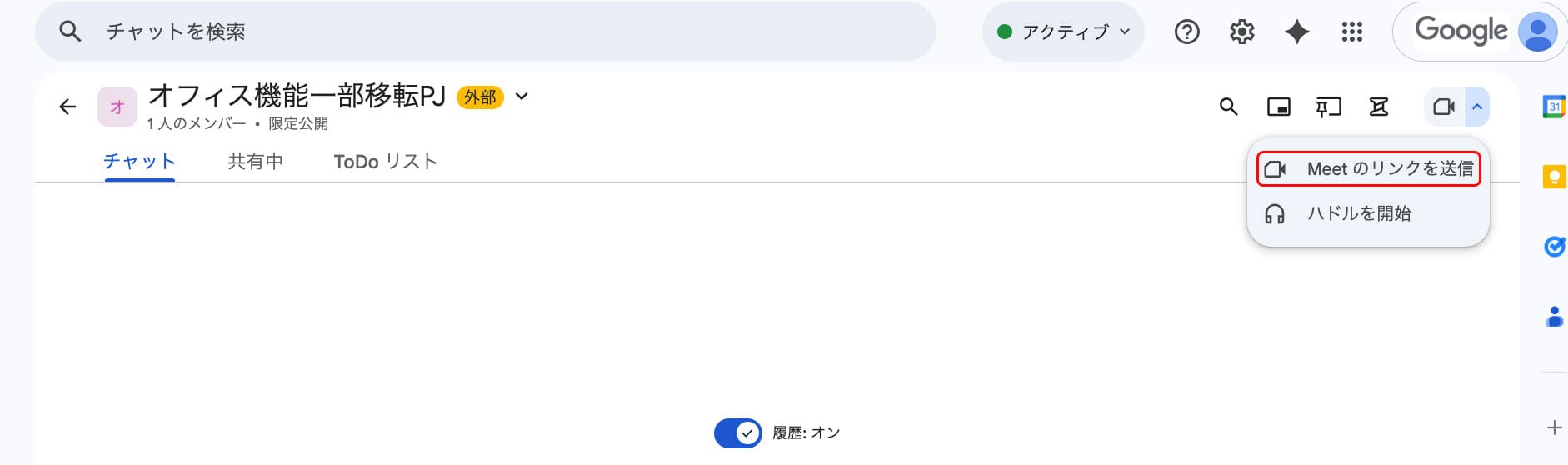 - Google Chat で、ビデオ会議を始めたいユーザーとのチャットまたはスペースを開く。