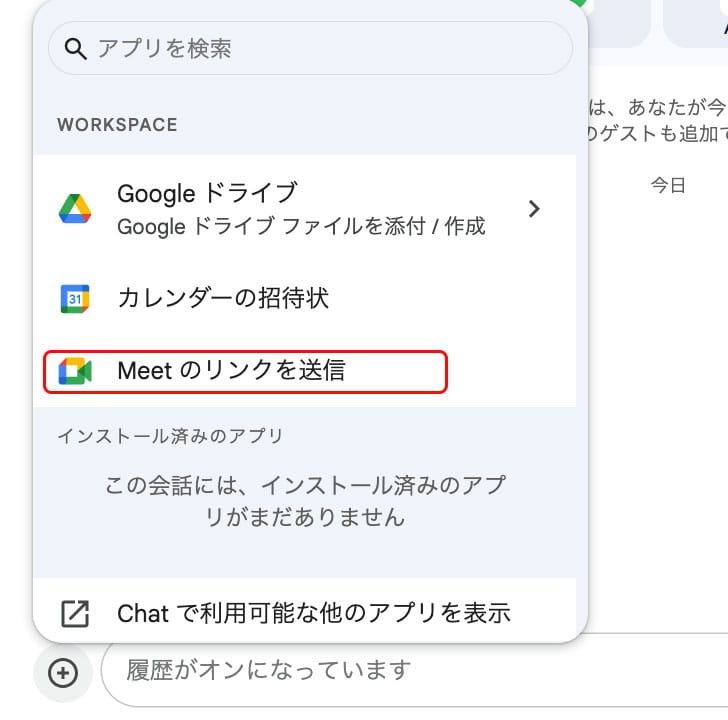 メッセージの横にある + アイコンからでも 「Meet のリンクを送信」 を選択できます。
