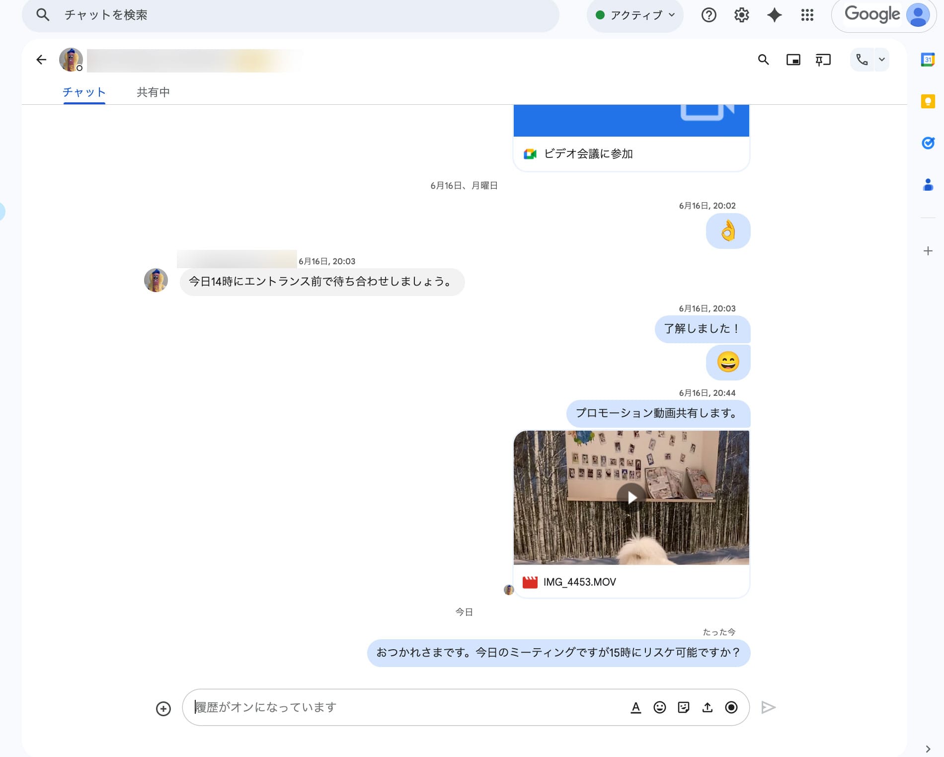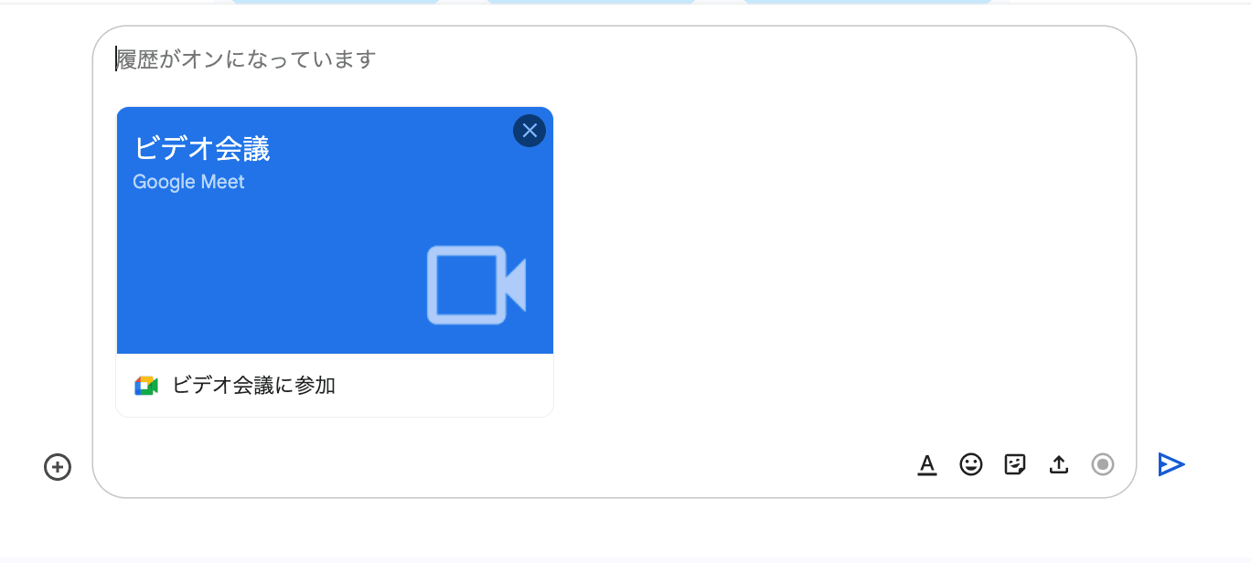 Google Chat では、チャット中の相手と即席で Google Meet を使ったビデオ会議を開始できます。口頭でのやり取りの方がスムーズだと思ったらすぐに会議を始めることが可能です。