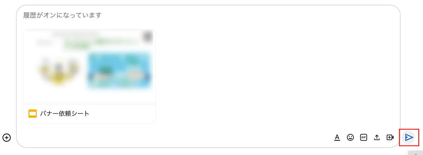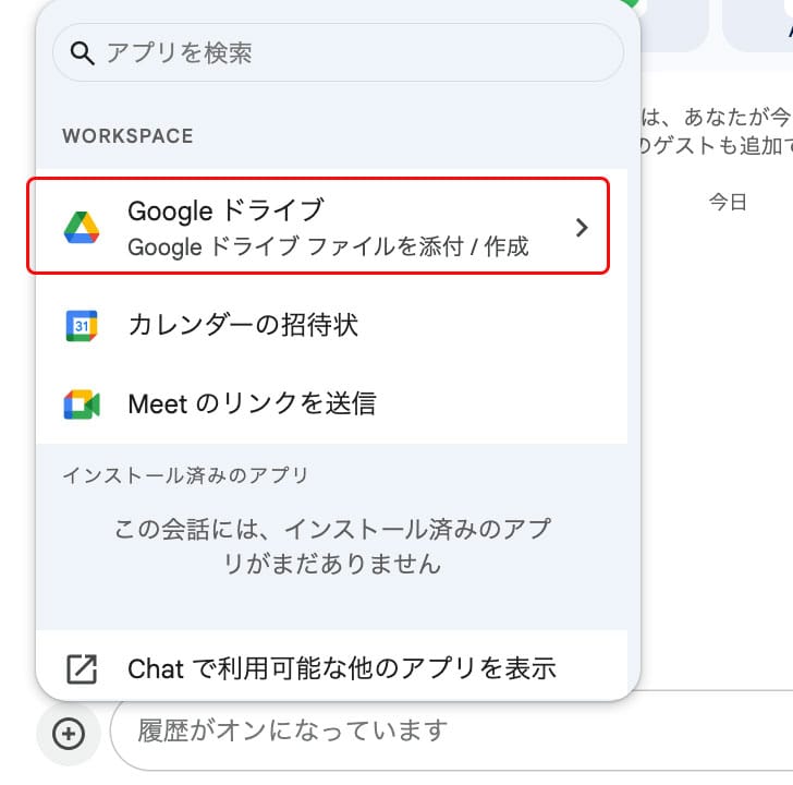 - ドライブにあるファイルを添付するには、メッセージを入力する枠の左側にある + アイコンをクリックし、 「Google ドライブ ファイルを添付」 を選択します。