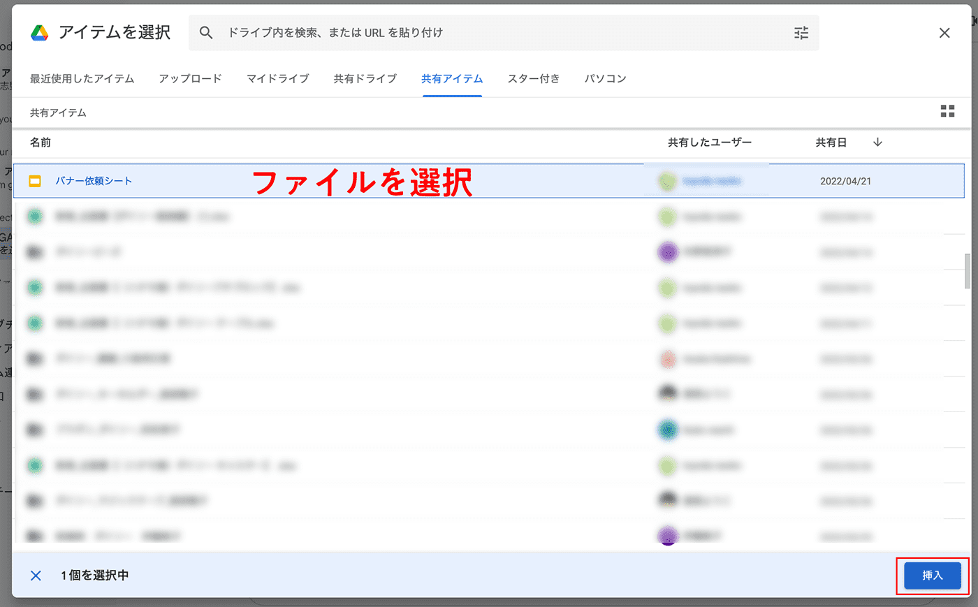 - 送信するファイルを選択したら、右下の 「挿入」 ボタンをクリックします。
