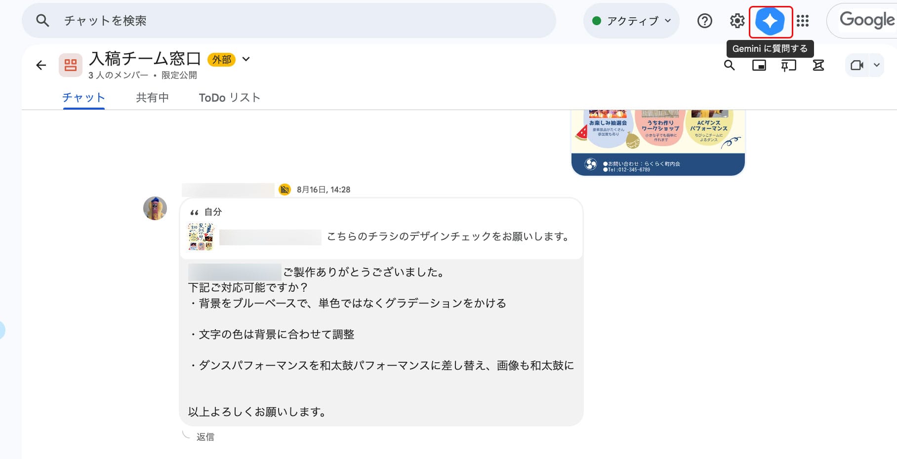 Google Chat では Gemini を活用して、業務の効率化を行うこともできます。ここでは、チャットの会話の要約やアクションアイテムの作成のやり方を紹介します。