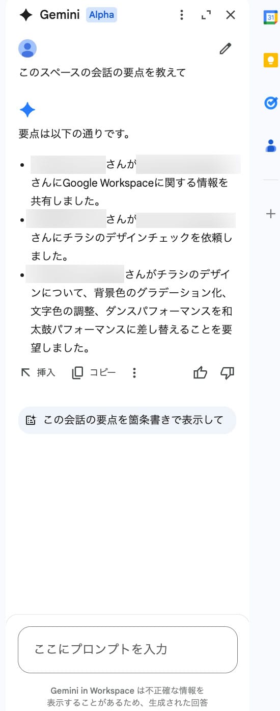 Gemini が会話の内容を分析し、結論や重要なポイントを返してくれます。
