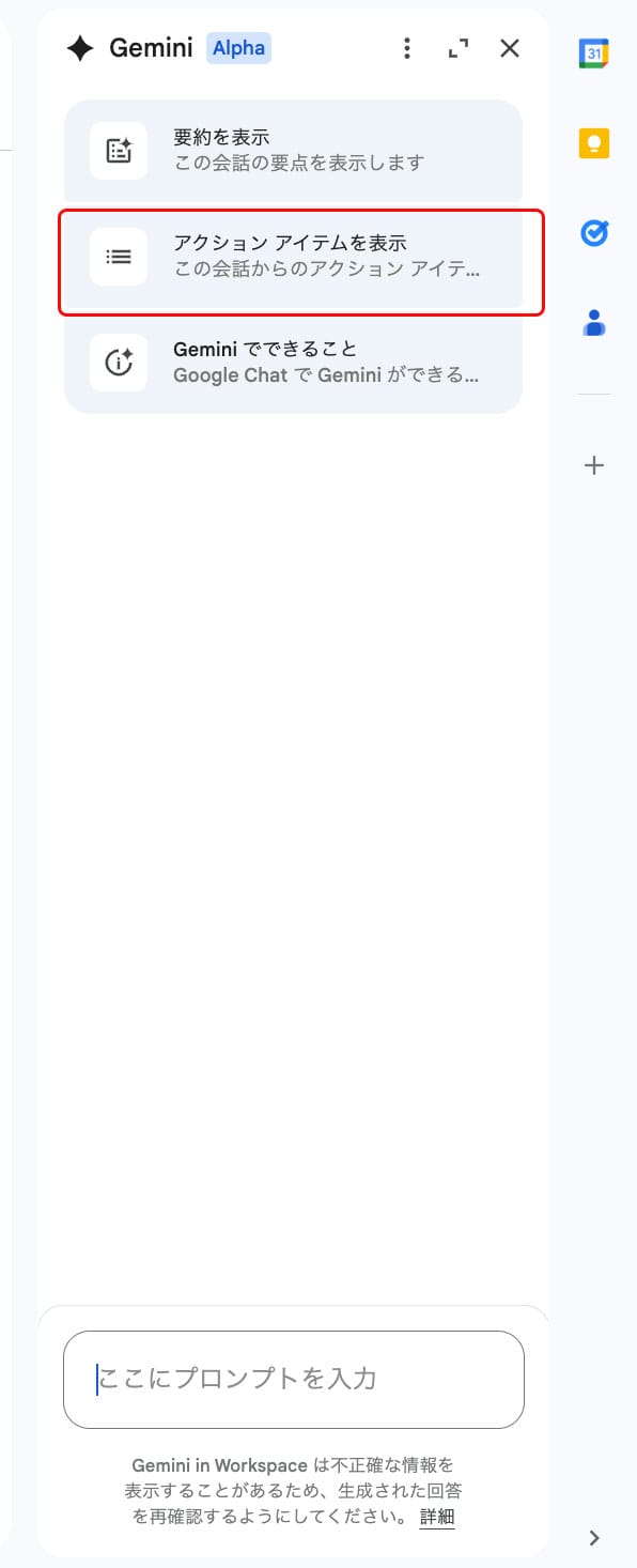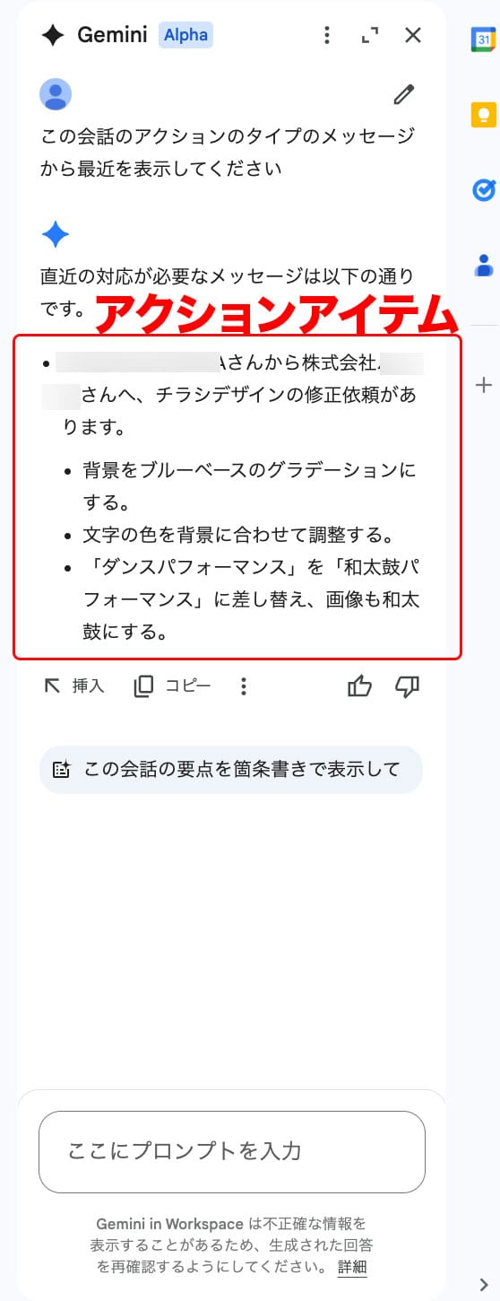 また、 Gemini のサイドパネルでは 「アクションアイテムの表示」 のエリアクリックすると会話からアクションアイテムを自動で抽出してくれます。