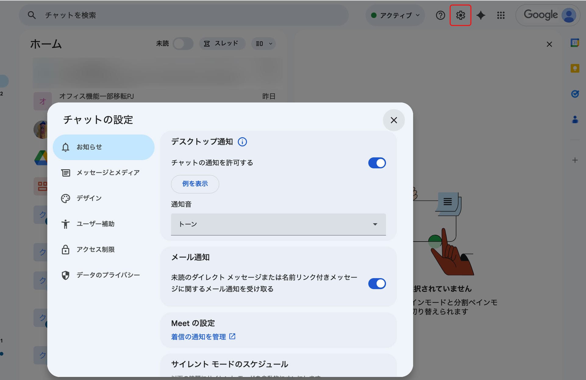 - Google Chat 右上の設定アイコンをクリックして、チャットの設定を開きます。