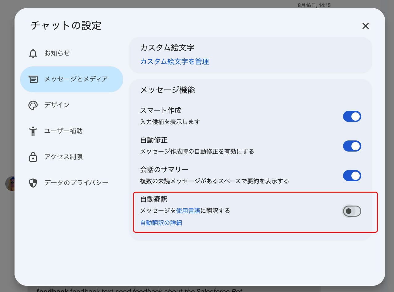 自動翻訳機能を利用するには、一度 Google Chat の再読み込みを行ってください。