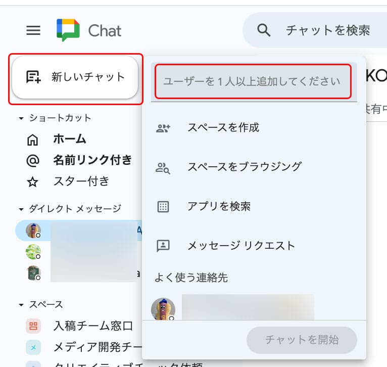 「チャット」 に名前が表示されない場合は、左上の 「新しいチャット」 をクリックし、 「ユーザーを1人以上追加してください」 という枠にチャットをしたいユーザーのメールアドレス (Google Workspace アカウント) を入れて検索します。