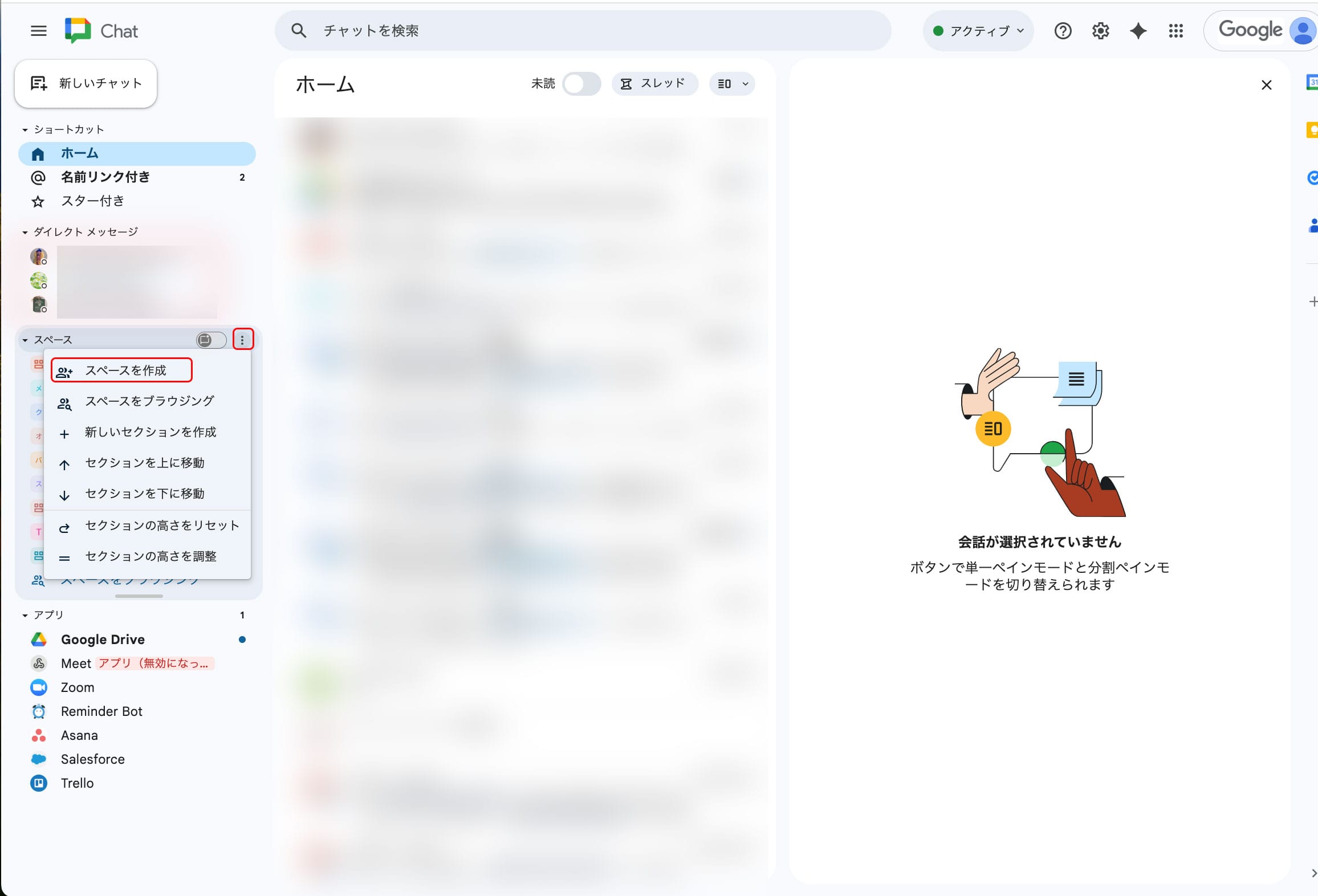 - [スペース] の横にある縦3点リーダー (︙) > 「スペースの作成」 をクリックします。